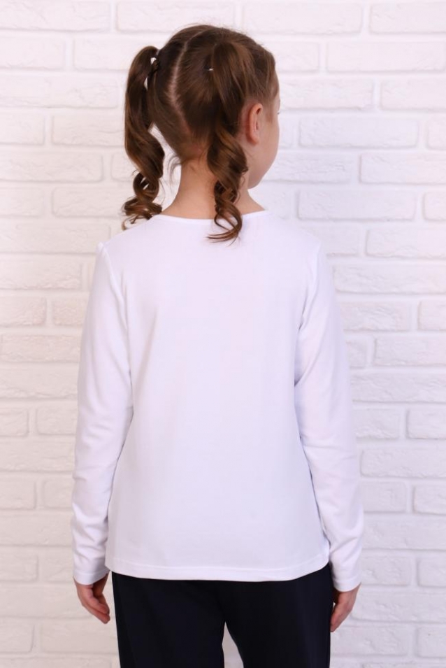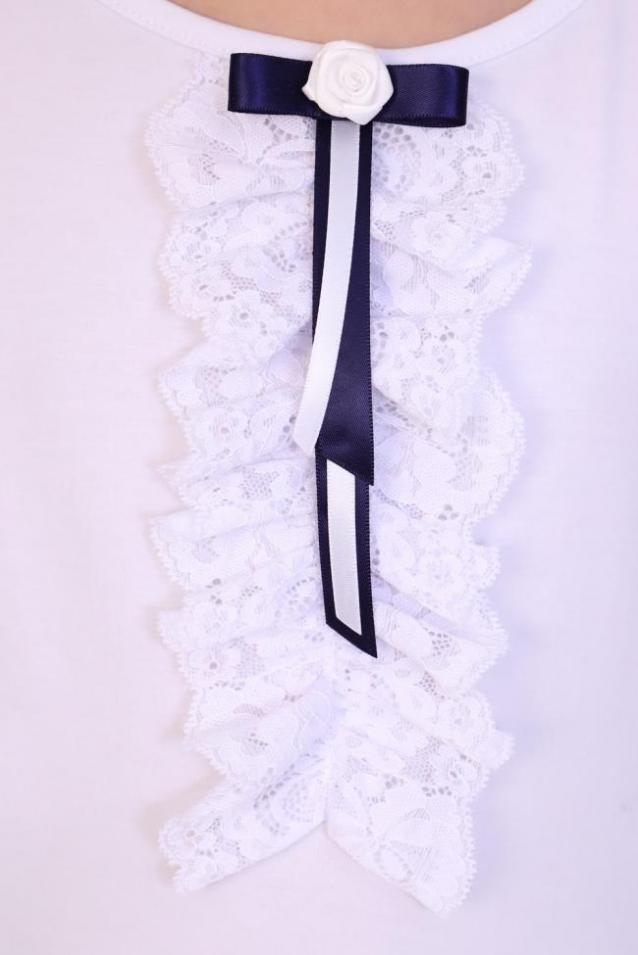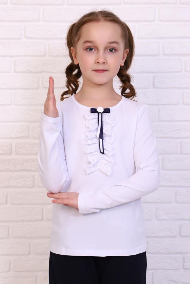 Джемпер для девочек младшего и старшего школьного возраста, из однотонного трикотажного полотна. Джемпер прилегающего силуэта, с втачным рукавом. Спереди и на спинке отсутствуют линии членения. По центру переда настрочено жабо из кружева. Рукава длинные. Низа рукавов и изделия подогнуты. Горловина окантована. Спереди прикреплен декоративный элемент.