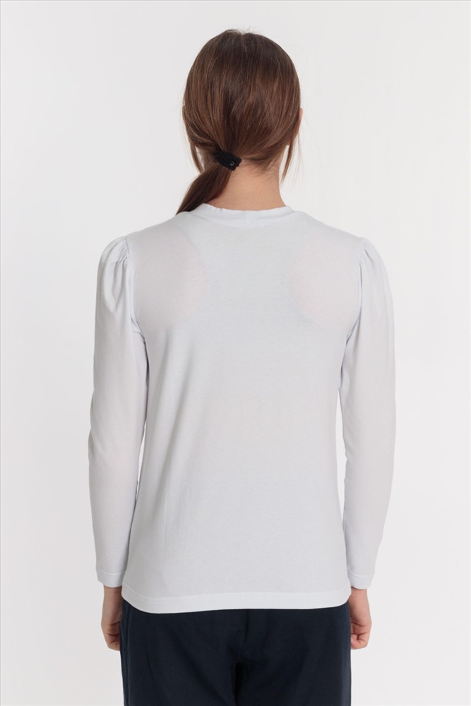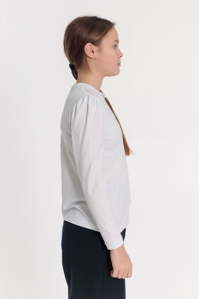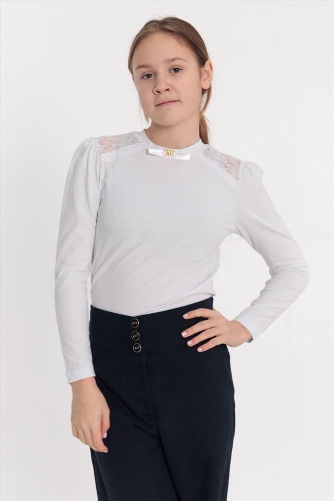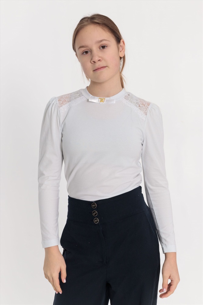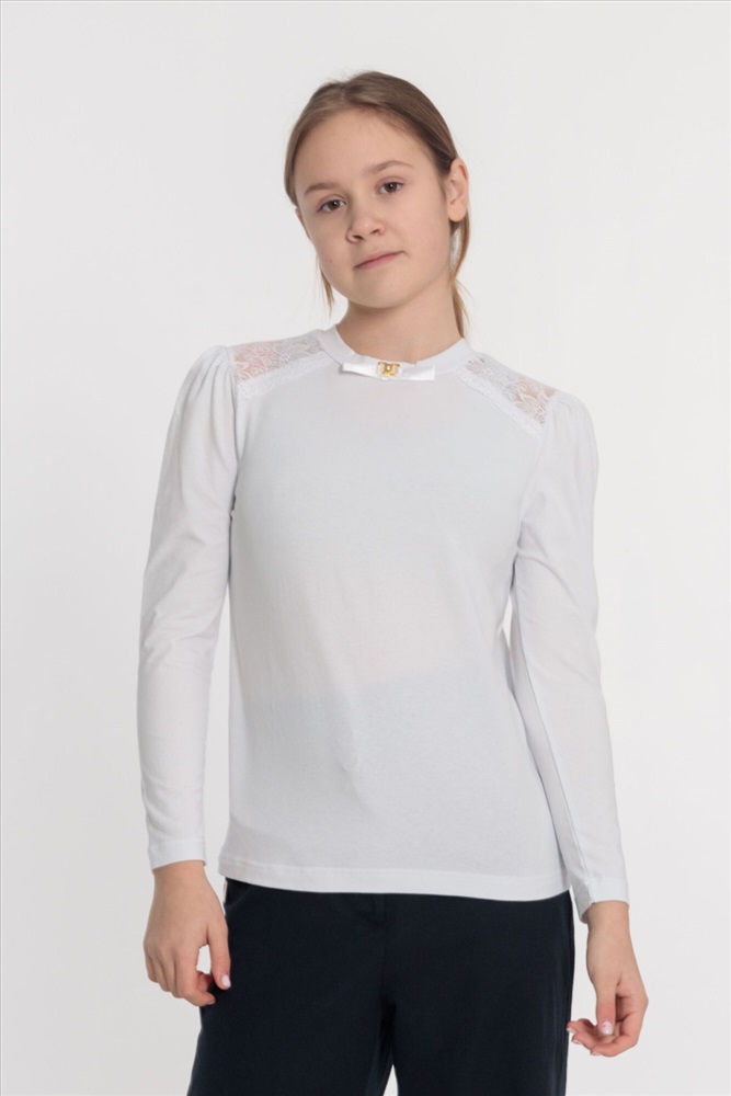 С капюшоном: Нет С карманами: Нет Сезон: Летний Силуэт: Облегающий Состав: Хлопок 95% Лайкра 5% Цвет Номенклатуры: белый Джемпер из хлопка с лайкрой. С кружевными кокетками спереди и отделочным атласным бантом и металлическим украшением, на притачной планке горловины. Рукав длинный со сборкой на окате. Комментарии к товару
