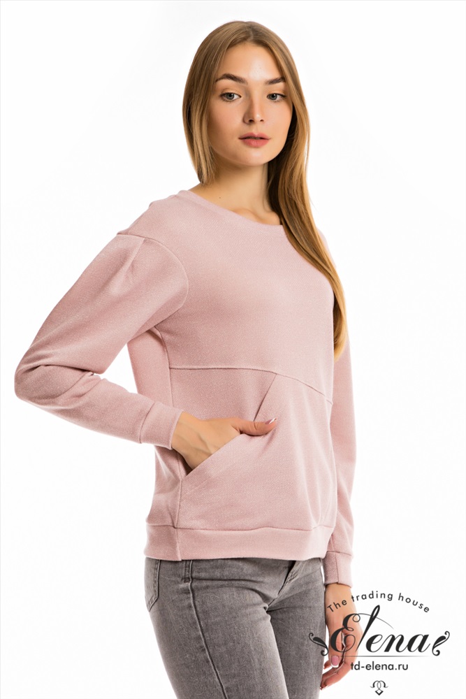 Джемпер выполнен из футер петли с люрексом. Спереди расположен карман. На рукавах, в шве проймы, заложены складки, низ рукавов и изделия оформлены манжетами и поясом. Горловина с притачной планкой.