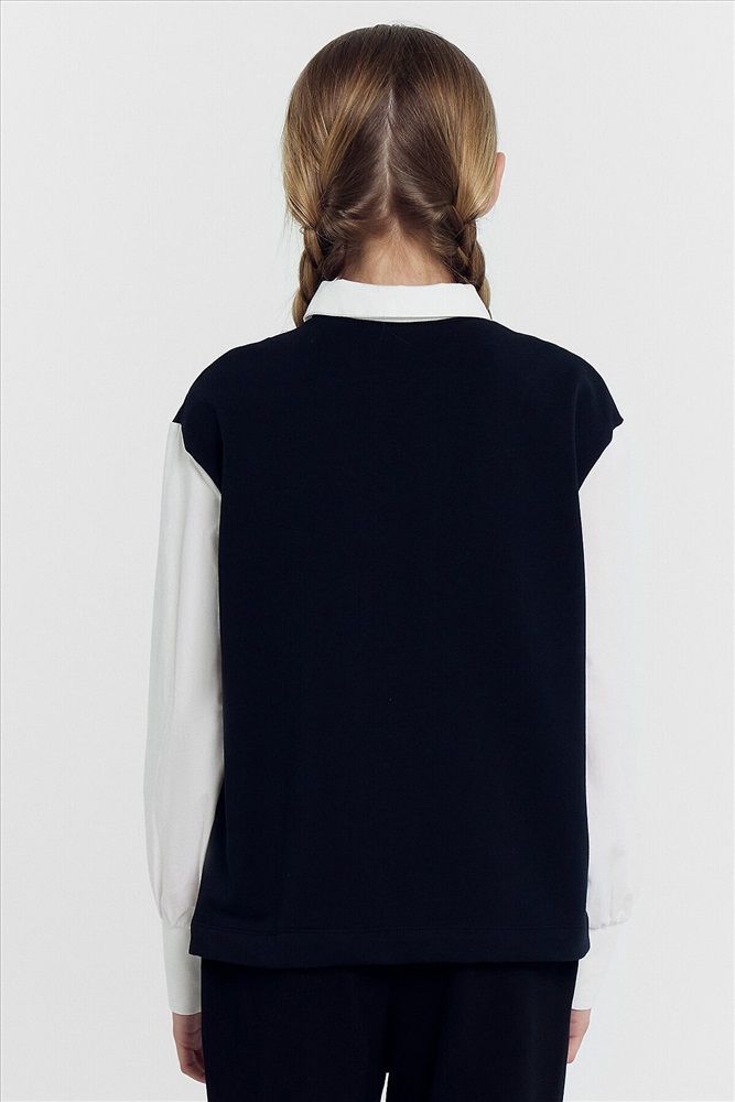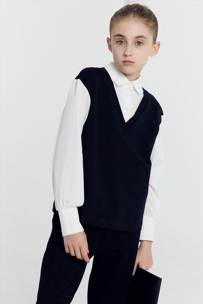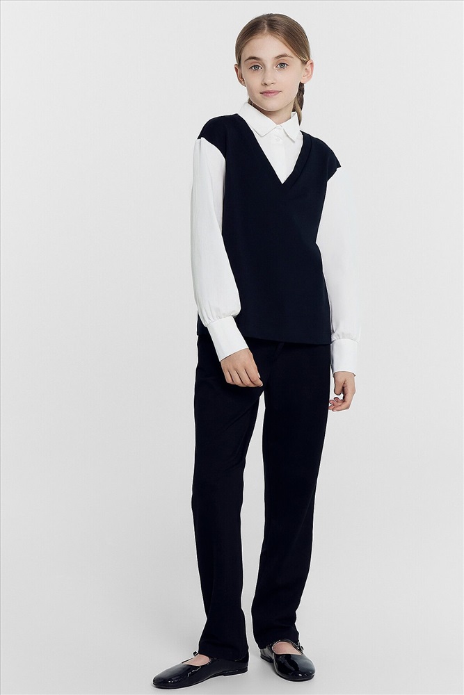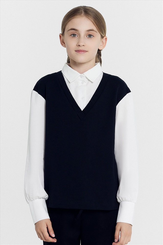 Джемпер свободного силуэта, с имитацией жилетки и рубашки. Жилет из селаника горловина V-образной формы. Рубашка из ткани горловина круглой формы, воротник с цельнокроенной стойкой. По переду центральная застежка на пуговицы. Плечо спущено, пройма углубленна. Рукава втачные, длинные из ткани. Низ рукава немного расширен и присборен, по низу рукава отрезная манжета из ткани. Низ изделия обработан швом в подгибку.