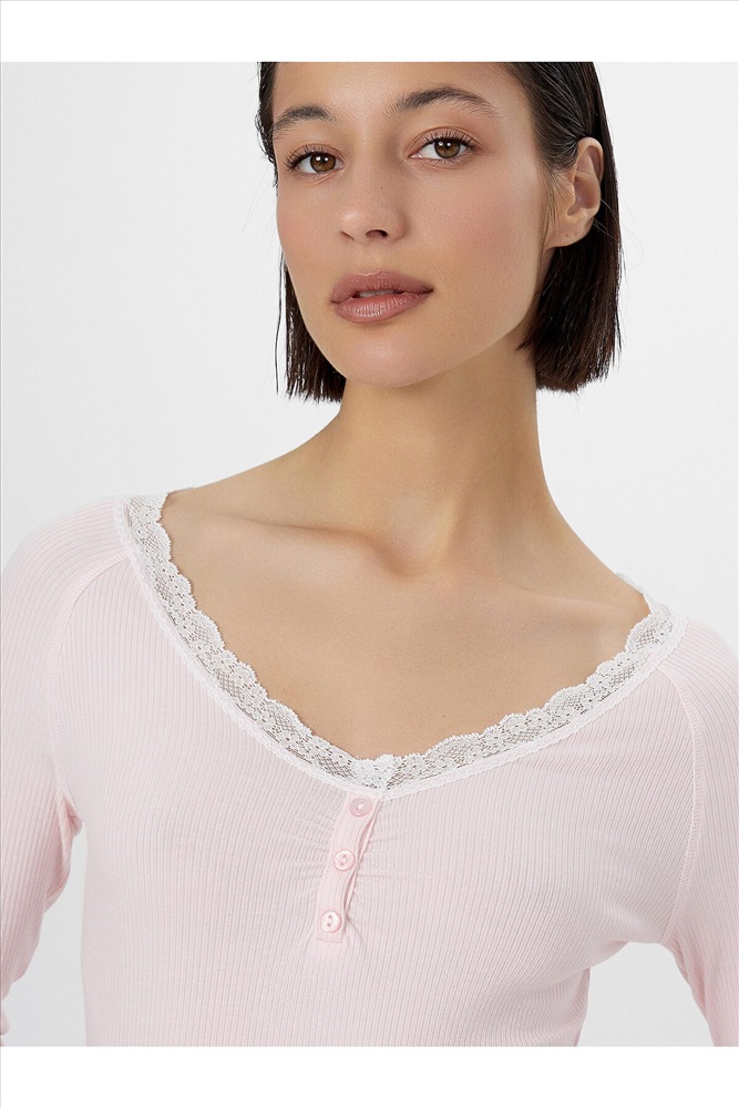 Джемпер женский прилегающего силуэта. Спинка и перед цельнокроеные. Горловина круглой формы обработана на плоскошовной машине с контрастными нитками и кружевом 3см (antik dantel 2715). По центру центральная застежка (иммитация) с пуговицами 10мм. Область груди немного присборена. Рукав реглан, длинный, шов притачивания обработан на плоскошовной машине с контрастными нитками, низ рукава обработан на микрооверлоке с контрасной ниткой . Низ изделия обработан в подгибку с контрастными нитками.