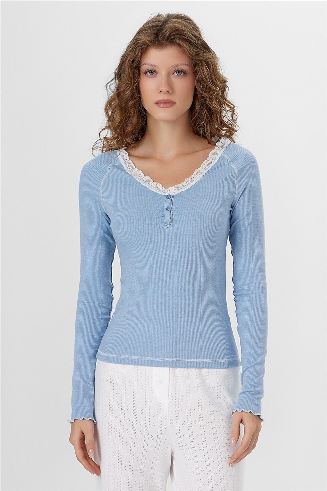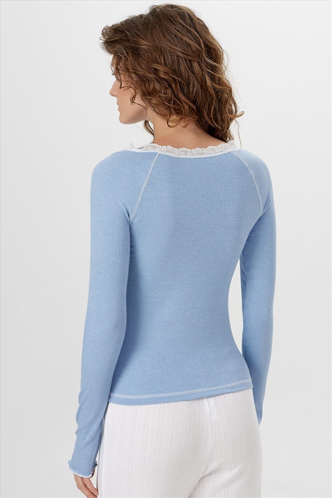 Главная особенность - нежное кружево, украшающее линию декольте, что добавляет образу элегантную нотку соблазнительности. Круглый вырез горловины с контрастной строчкой подчеркивает эту красивую деталь.