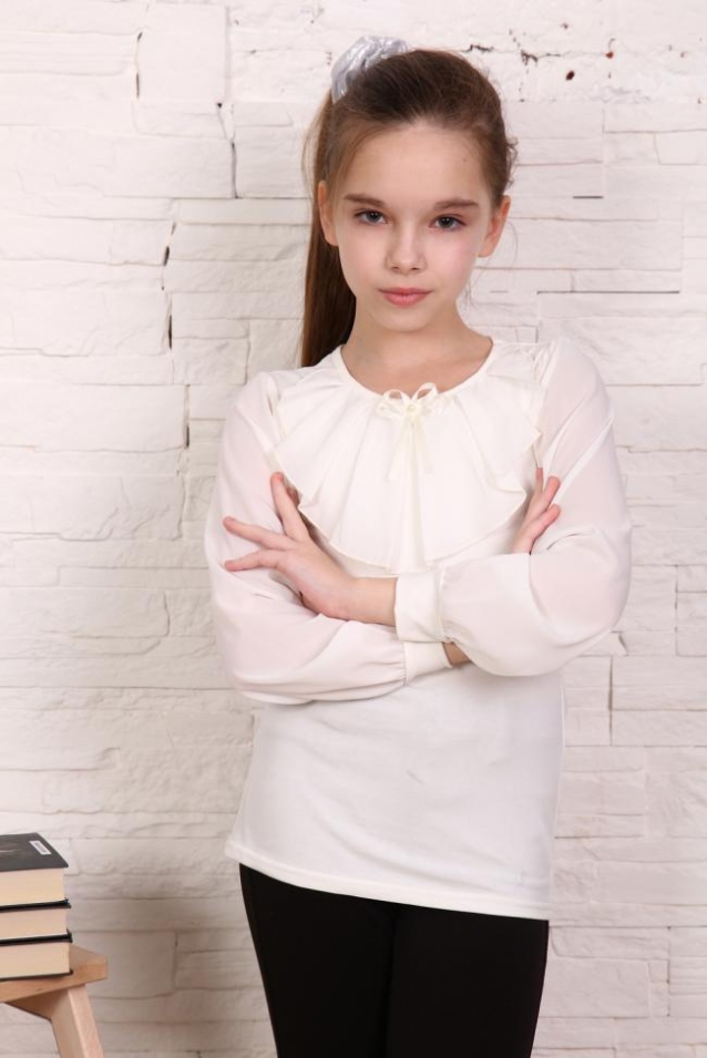 Джемпер для девочек младшего школьного возраста, из однотонного трикотажного полотна - однотонная кулирка с лайкрой и шифона. Джемпер полуприлегающего силуэта, с рукавом из шифона, без застежки. Спереди жабо со складками из шифона с декоративным элементом по центру. На спинке отсутствуют линии членения. Рукав длинный одношовный, присборенный по окату и низу, на манжете. Низ изделия подогнут. Срез горловины окантован.