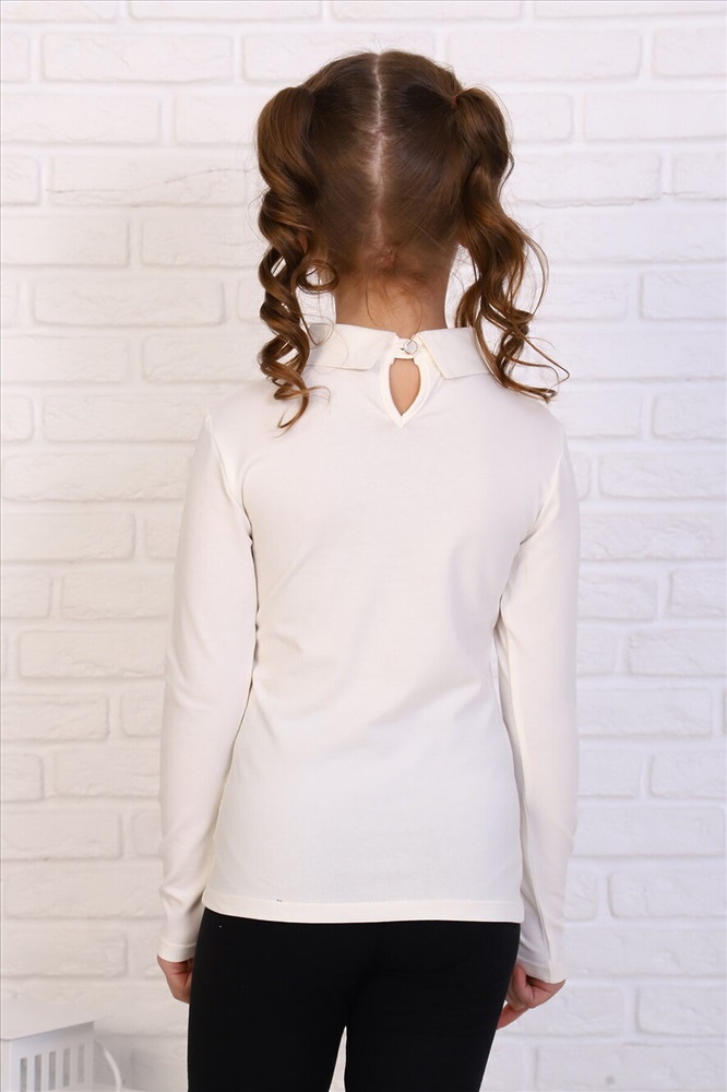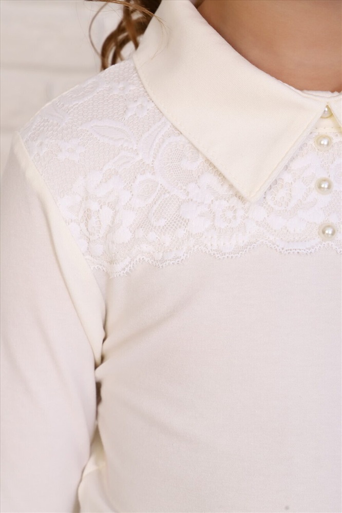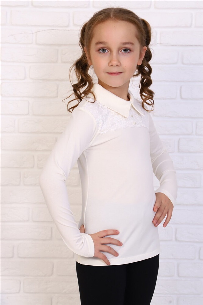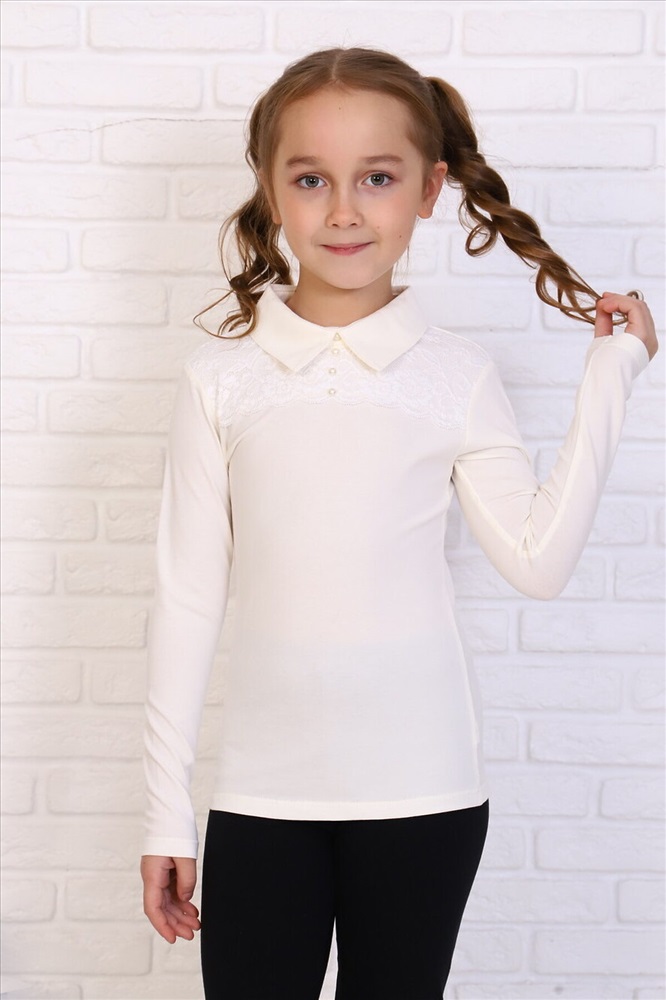 Джемпер для девочек младшего и старшего школьного возраста, из однотонного трикотажного полотна кулирка с лайкрой. Джемпер полуприлегающего силуэта, с втачным рукавом, с застежкой на одну пуговицу и петлю, с сорочечным воротником со стойкой. На деталь переда из кулирки с лайкрой настрочена кружевная кокетка. На детали спинки разрез под застежку. Рукав длинный одношовный. Воротник сорочечный с отрезной стойкой. По отлету и концам воротника, по шву притачивания стойки в горловину и шву стачивания стойки с воротником проложена отделочная строчка. На кокетку переда по центру приклеены 4 бусины. Низа рукавов и изделия подогнуты.