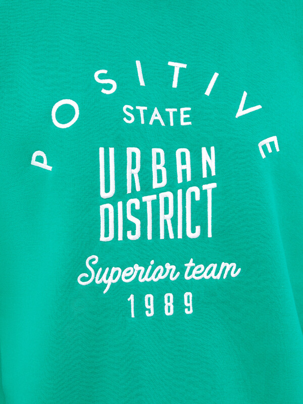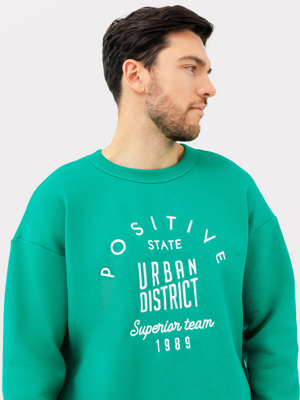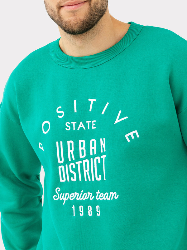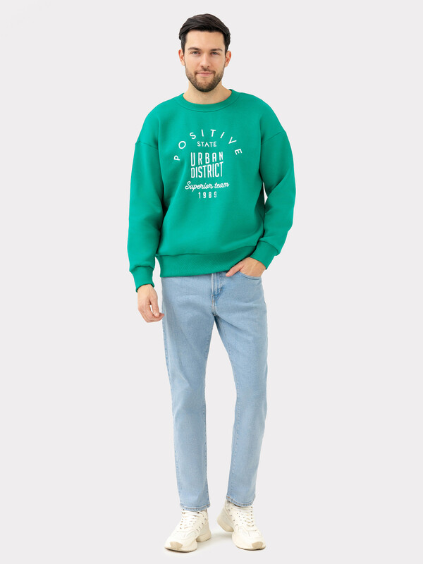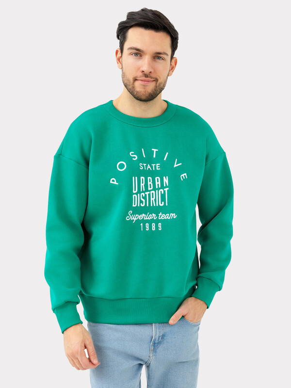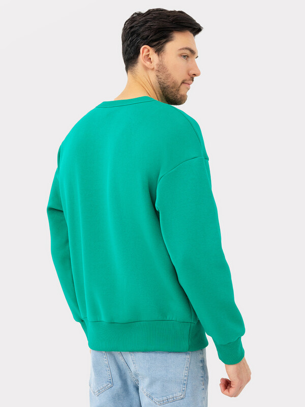 Джемпер прямого силуэта из трикотажного футера с теплым подчесом. Горловина круглой формы, окантована широкой бейкой из рибаны. Плечо слегка спущено, рукава длинные, с манжетами из рибаны – как и пояс, проходящий по низу джемпера. Стильно!