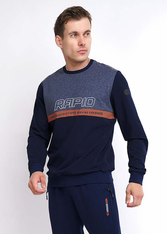 Комбинированный свитшот мужской из футера интересен благодаря ко. Шрифтовой принт спереди придает оригинальный акцент. Удобная модель будет необходимым помощником для образа в стиле casual.