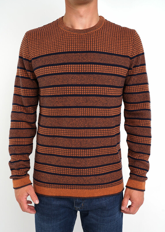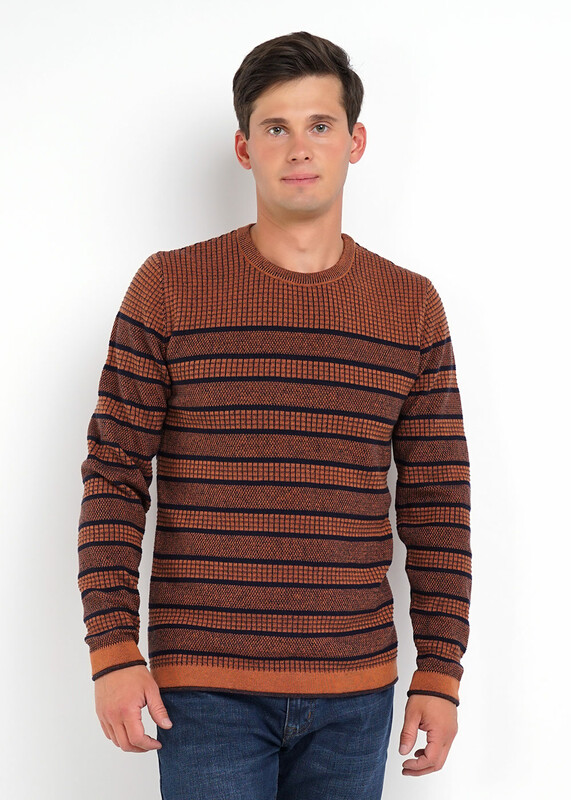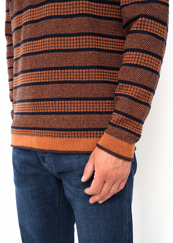Мужской джемпер из смесовой пряжи с круглым вырезом горловины и втачным длинным рукавом. Изделие в оригинальной расцветке с комбинированной провязаной полосой и фирменной металлофурнитурой по низу. Подойдет для выходов в город с джинсами либо брюками.