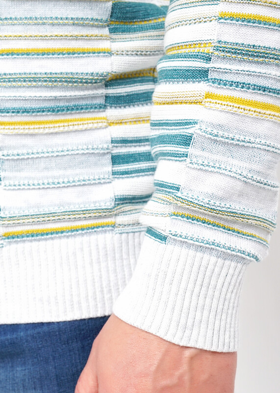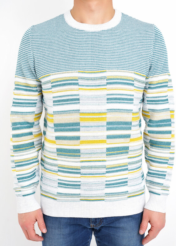 Мужской джемпер из смесовой пряжи с круглым вырезом горловины и длинным рукавом. По низу рукава и изделия комфортная эластичная резинка. Модель интересна за счет кокетки и комбинации плашечной цветной вязки, а так же дополнена металлофурнитурой.