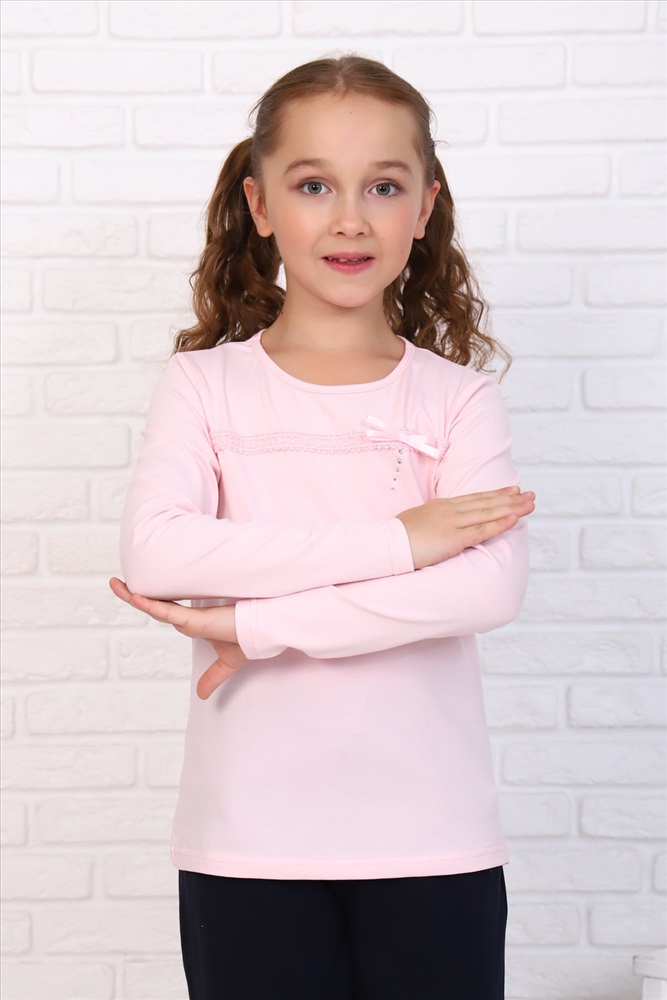 Блузка для девочек младшего и старшего школьного возраста, из однотонного трикотажного полотна. Блузка прилегающего силуэта, с втачным рукавом. Спереди и на спинке отсутствуют линии членения. Рукава длинные. Низа рукавов и изделия подогнуты. Горловина окантована. Спереди по линии груди настрочено кружево и прикреплен декоративный элемент из страз и атласной ленты.