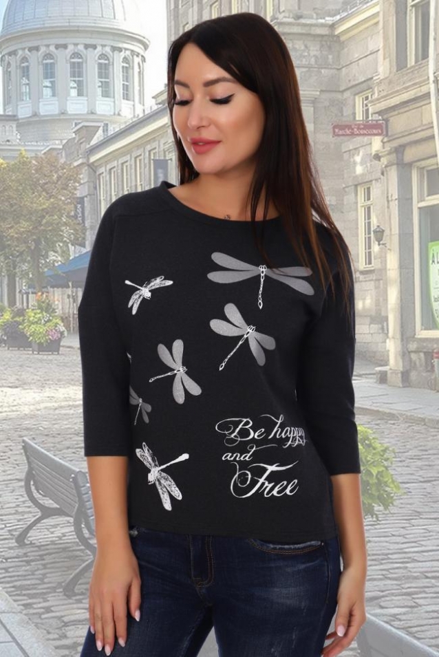 Джемпер с принтом, круглая горловина обработана обтачкой, спущенная пройма, рукав 3/4. На спинке кокетка, низ спинки слегка удлинён.