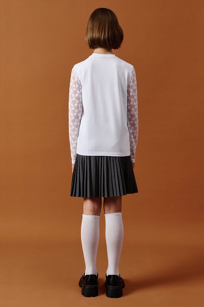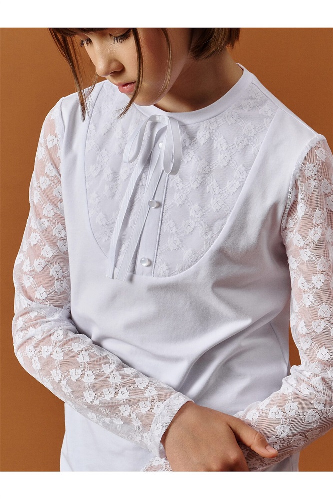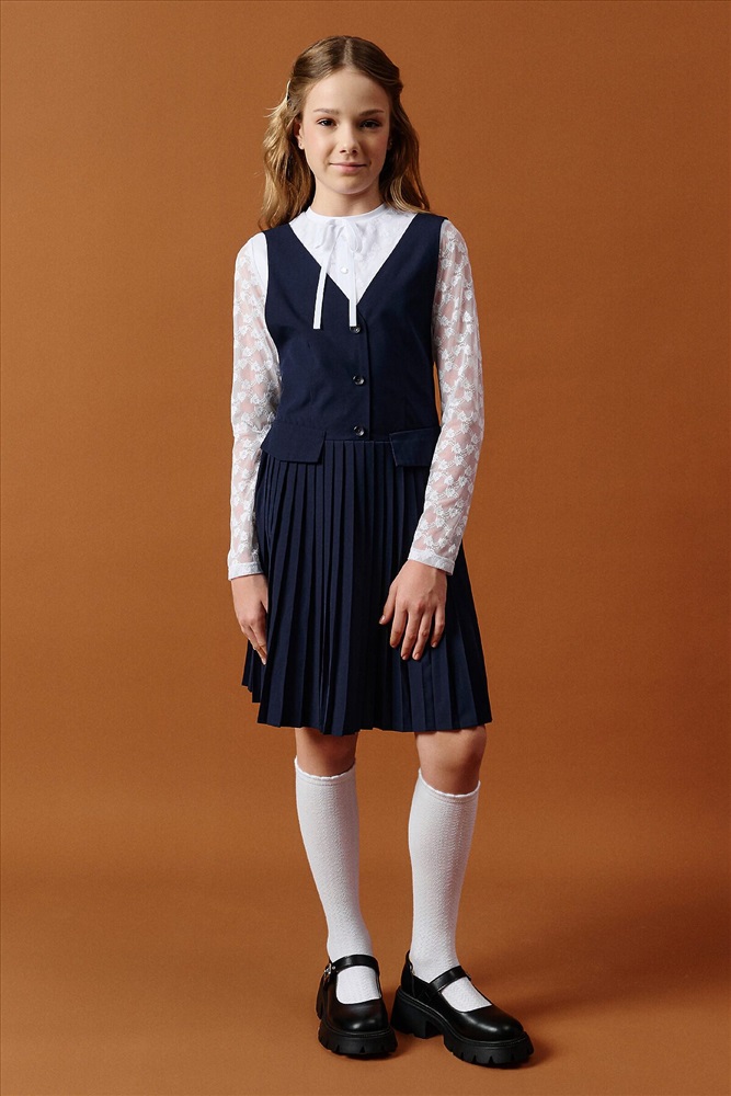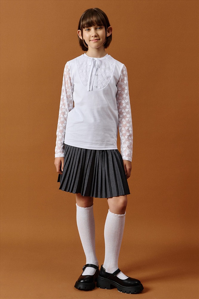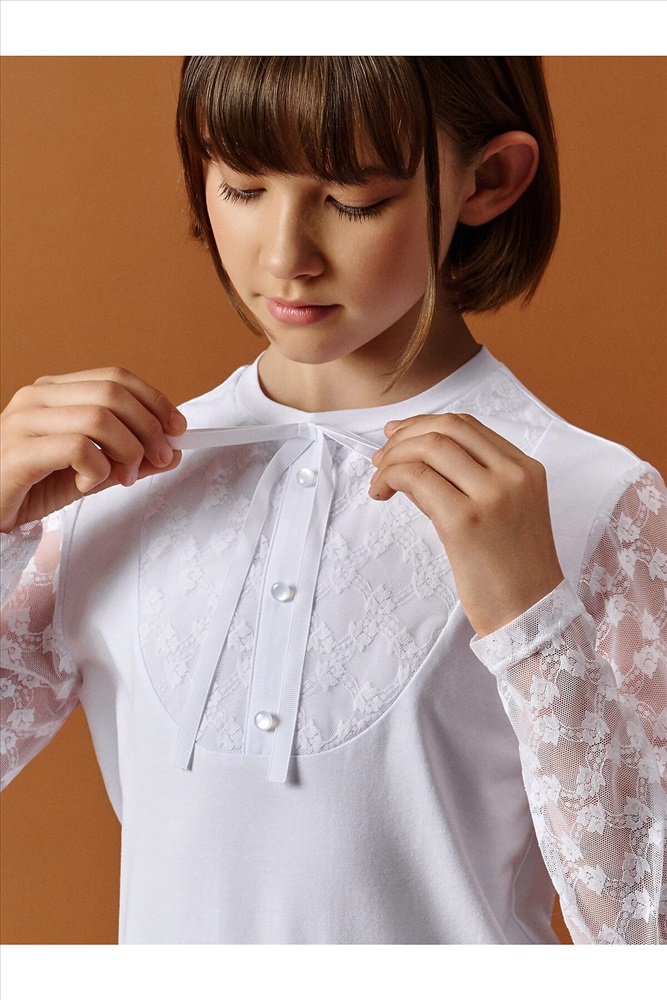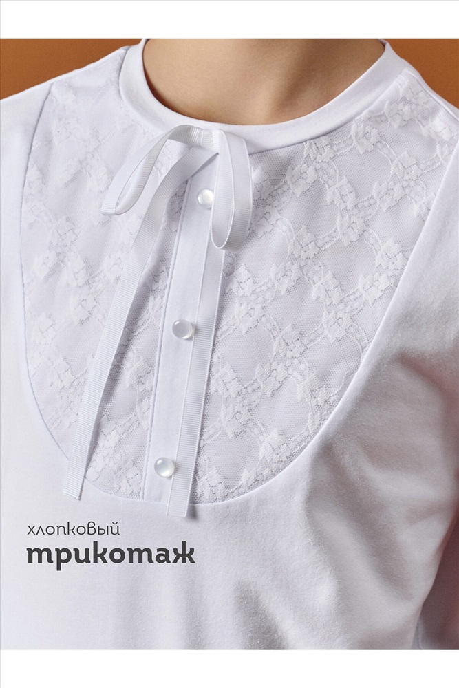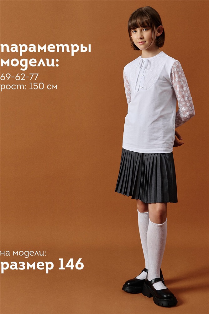 Страна производства: Китай Блузка школьная для девочки — нарядная, кружевная, удобная Трикотажная блузка для школы — идеальный выбор для учебных будней и торжественных линеек. Модель выполнена из мягкого эластичного хлопкового трикотажа с кружевными элементами. Ткань приятна к телу, хорошо тянется, не сковывает движений и отлично подходит для длительной носки. Особенности модели: Фигурная кокетка овальной формы в зоне декольте — делает образ аккуратным и нарядным Кокетка двойная: нижний слой — трикотаж, верхний — эластичное кружевное полотно, которое не колется и не раздражает кожу Планка с тремя пуговицами по центру — изящный классический элемент, который подчёркивает стиль школьной формы Длинные облегающие кружевные рукава делают образ лёгким и элегантным Уютная горловина с мягкой трикотажной бейкой и бантиком из репсовой ленты — милый акцент, который оценят девочки Преимущества: ✔ Отлично подходит как школьная форма для девочек ✔ Стильная и нарядная блузка для праздников, линеек, концертов ✔ Комфортна даже при длительной носке — мягкий материал и удобный крой ✔ Легко стирается, не теряет форму и цвет ✔ Универсальна: сочетается с юбками, брюками, сарафанами Используйте таблицу размеров на фотографии, чтобы выбрать подходящий размер. Обратите внимание, что цвет товара на экране вашего устройства может отличаться от реального.