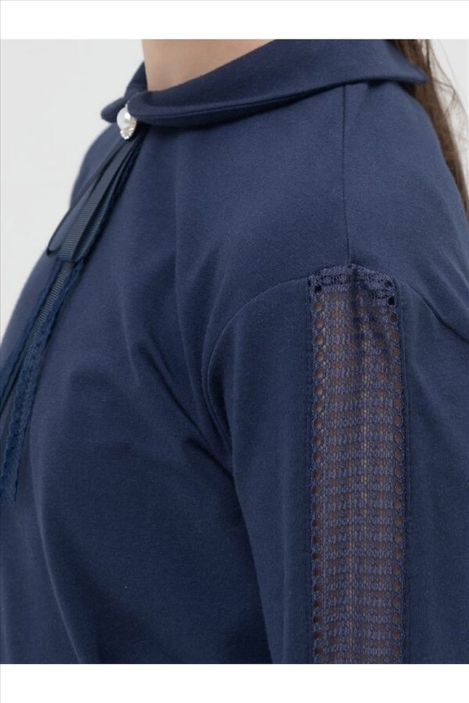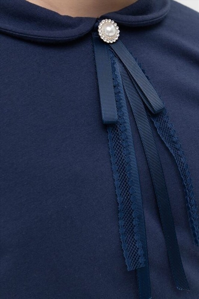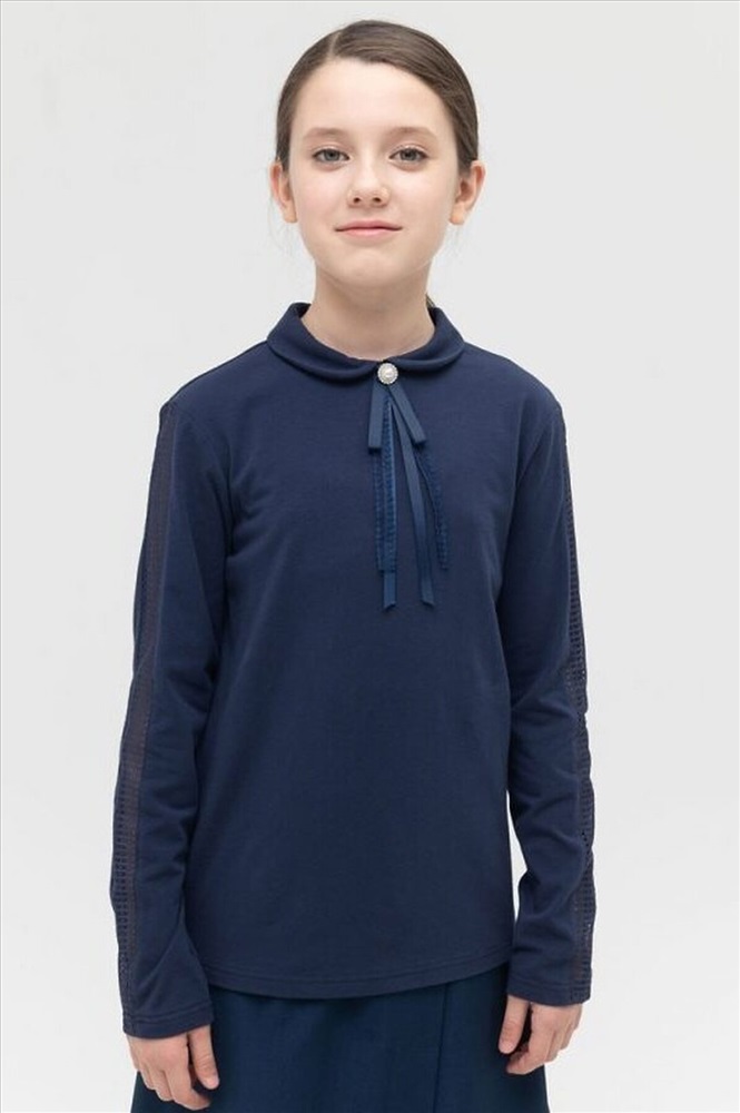 Школьный джемпер из хлопкового трикотажа. Мягкая, комфортная ткань хорошо держит форму и не растягивается. Эластичное кружево по рукаву, круглый воротник с бантом из репсовых и кружевных лент, закрепленный пуговицей с жемчужиной и стразами стильные фишки этой модели. Удобная застёжка сзади воротника позволит легко надеть джемпер и не испортить причёску. Этот красивый практичный джемпер станет любимым в гардеробе юной модницы.