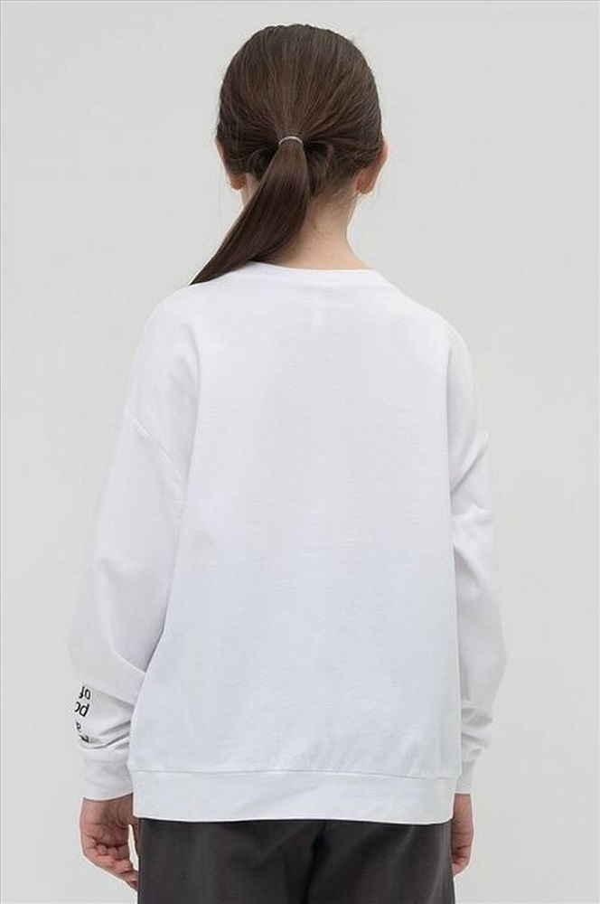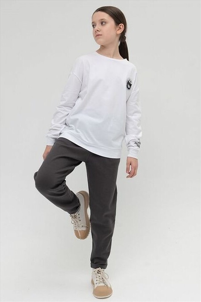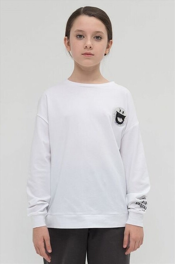 Мягкий, приятный к телу трикотажный джемпер для девочки. Удобный и свободный, ведь прямой силуэт и спущенное плечо не стесняют движения. Белый цвет изделия не боится стирок и ежедневной носки. Хорошо сочетается с любыми брюками или юбкой. Важные акценты. Оригинальный принт со смыслом на рукаве С другой точки зрения (перевод). Объемная нашивка смайлик с блестящим конфетти внутри. Современный джемпер, который легко полюбить, приятно носить в школе и в кругу друзей и везде чувствовать себя особенной.