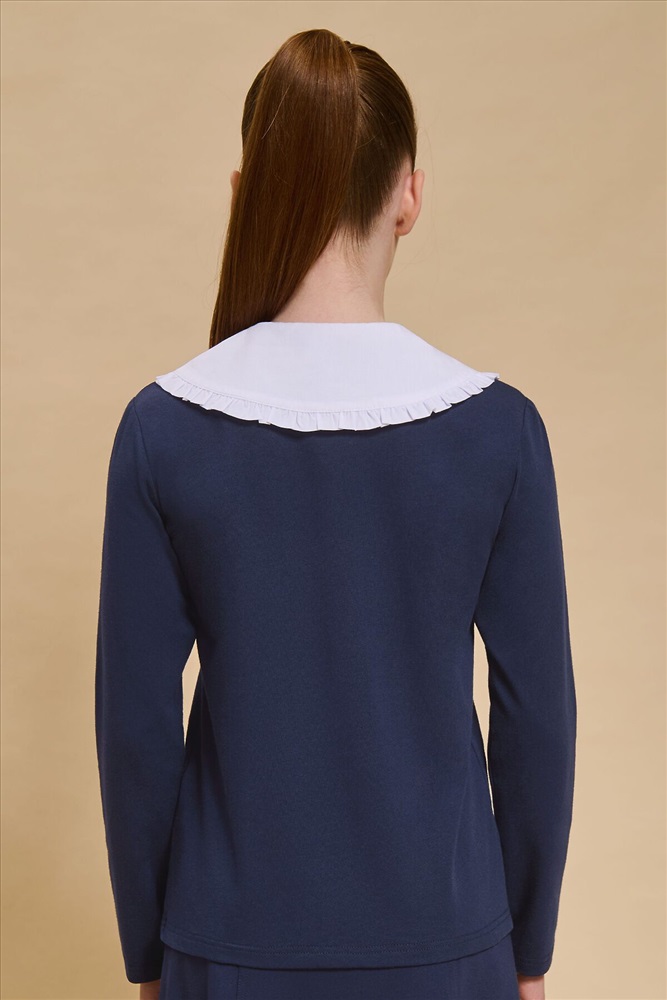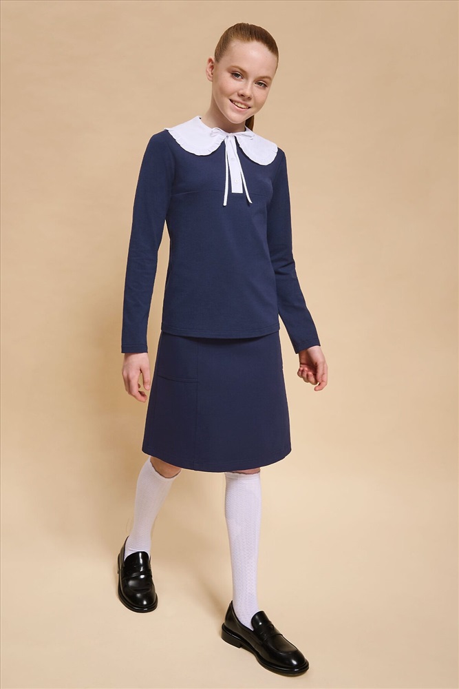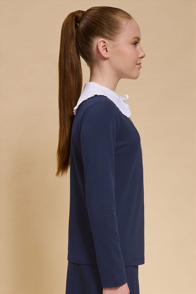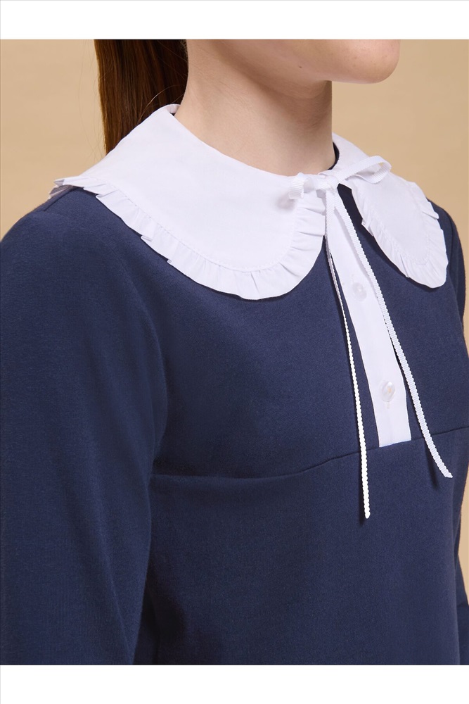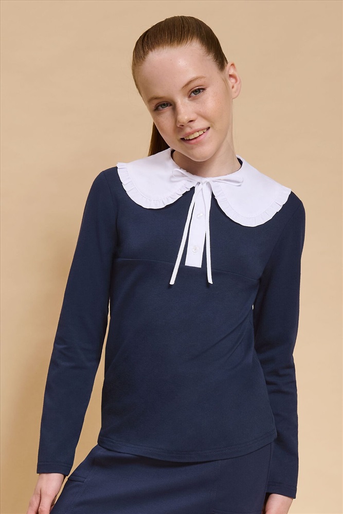 Страна производства: Китай Трикотажная блузка для девочек умеренного объёма, выполнена из эластичного хлопкового материала с длинным рукавом. Новым элементом в блузке является большой плосколежащий воротник фигурной формы, декорированный рюшей по внешнему краю, выполненный из отделочной швейной ткани. Удобство надевания изделия через голову обеспечивается спроектированной спереди планкой из швейного полотна с застежкой на пуговицы. Нижний край планки вшит в кокетку переда. Сзади под воротником пришита узкая декоративная репсовая тесьма, которая завязывается спереди на бантик под воротником.