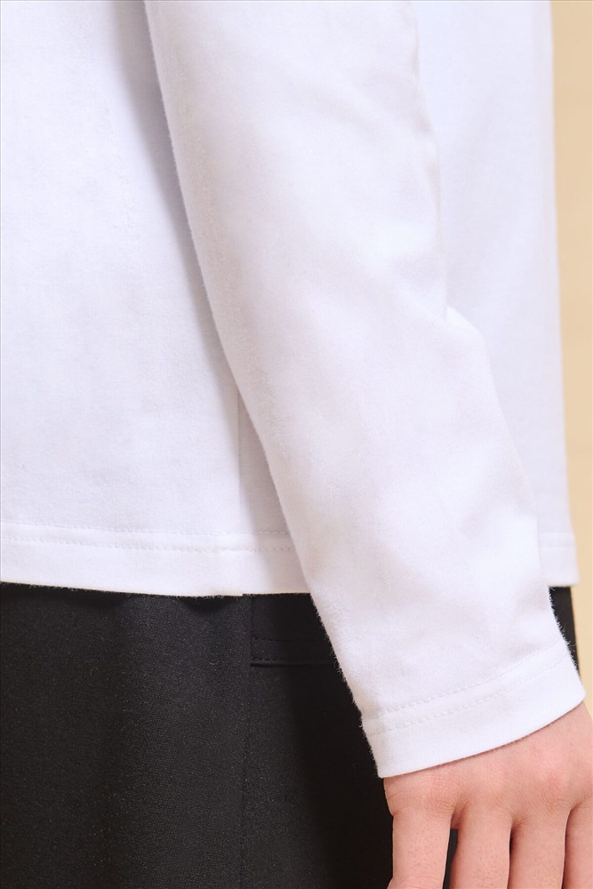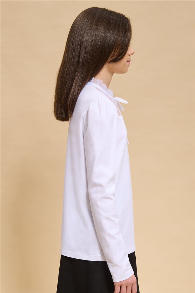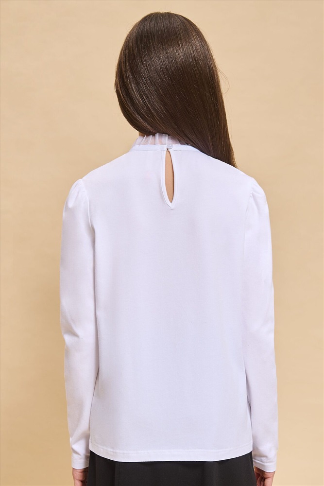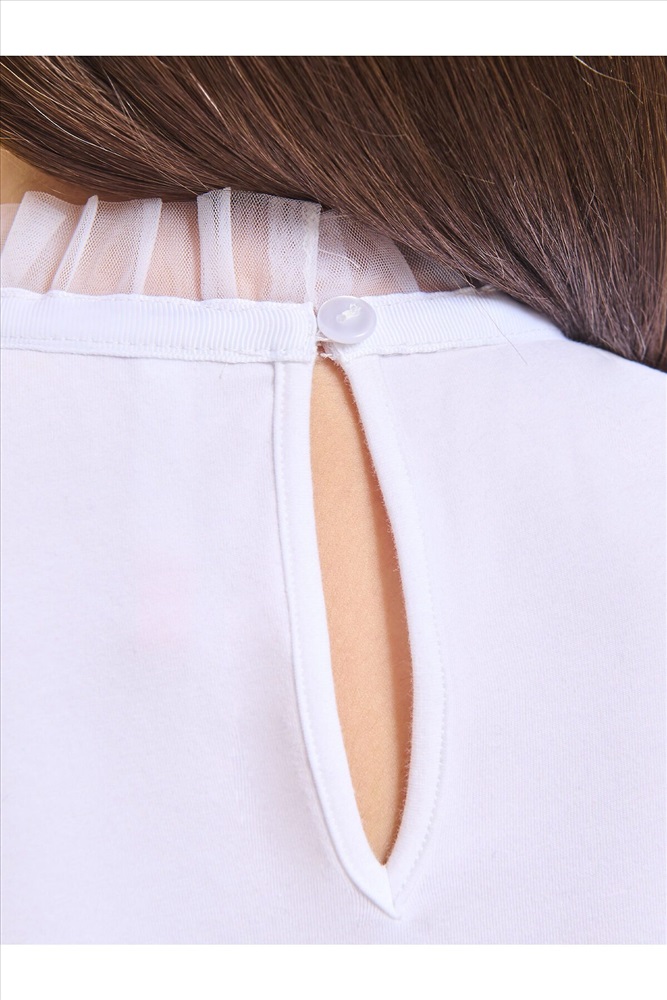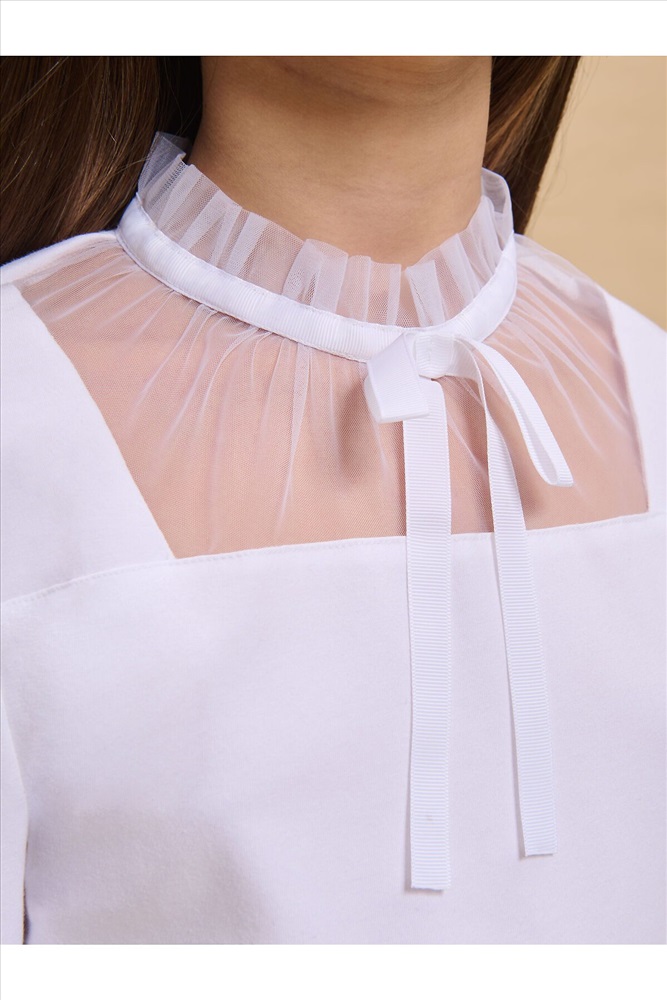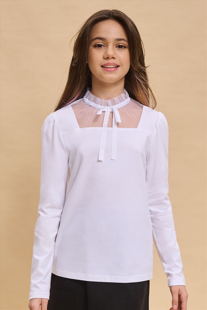 Джемпер с длинным рукавом, со сборкой по окату. Из мягкого хлопкового трикотажа с небольшим содержанием эластана, полуприлегающего силуэта с декоративной вставкой и рюшей по горловине из мягкой тонкой сетки. На горловину настрачивается репсовая лента, имитирующая миниатюрную стойку, на переде которой завязанный бант. По спинке застежка на пуговицу.