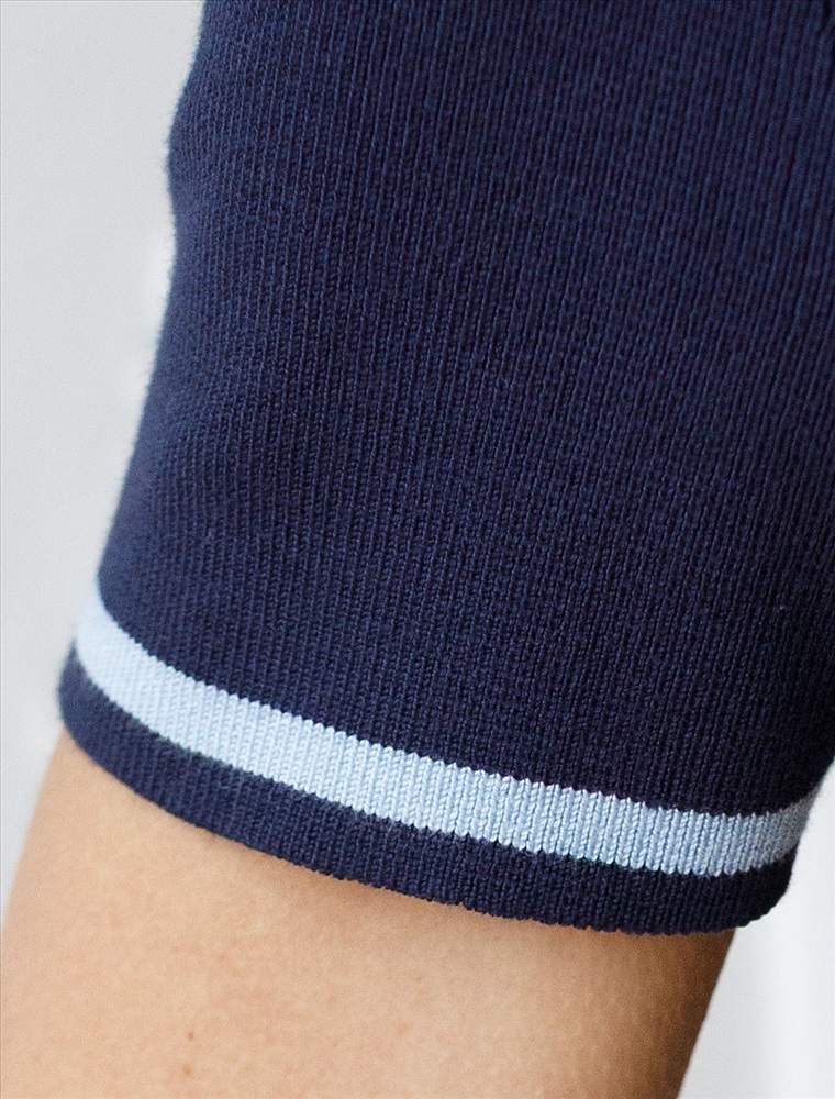 Состав: 80%Вис 20%ПА Легкий джемпер темно-синего цвета с V-вырезом и отложным воротником идеально подходит на весну и лето. Для производства изделия использована пряжа сердечникового прядения — когда нейлоновая нить (основа) обвивается вискозой. Вискоза обеспечивает приятную тактильность и гигроскопичность, а нейлон предотвращает растяжение и повышает устойчивость к пилингуемости. Вязка в тонкий рубчик дарит приятный комфорт и ощущение свежести в теплую погоду. Полуприлегающий крой подчеркивает силуэт, а универсальная длина позволяет сочетать джемпер с разными элементами гардероба. Контрастная отделка в виде тонких полосок добавляет стильный акцент, создавая выразительный образ. V-вырез подчеркивает зону декольте и визуально вытягивает шею, делая фигуру более изящной, а классический отложной воротник делает внешний вид более аккуратным и завершенным. Джемпер отлично смотрится на больших размерах благодаря продуманному крою и полуприлегающему фасону. Этот джемпер с коротким рукавом станет незаменимой частью гардероба в сезоны, когда хочется легкости и элегантности одновременно. Лаконичный дизайн обеспечивает простоту комбинирования с другими вещами и будет универсальной базой для создания разнообразных комплектов — от офисного до непринужденного городского стиля.