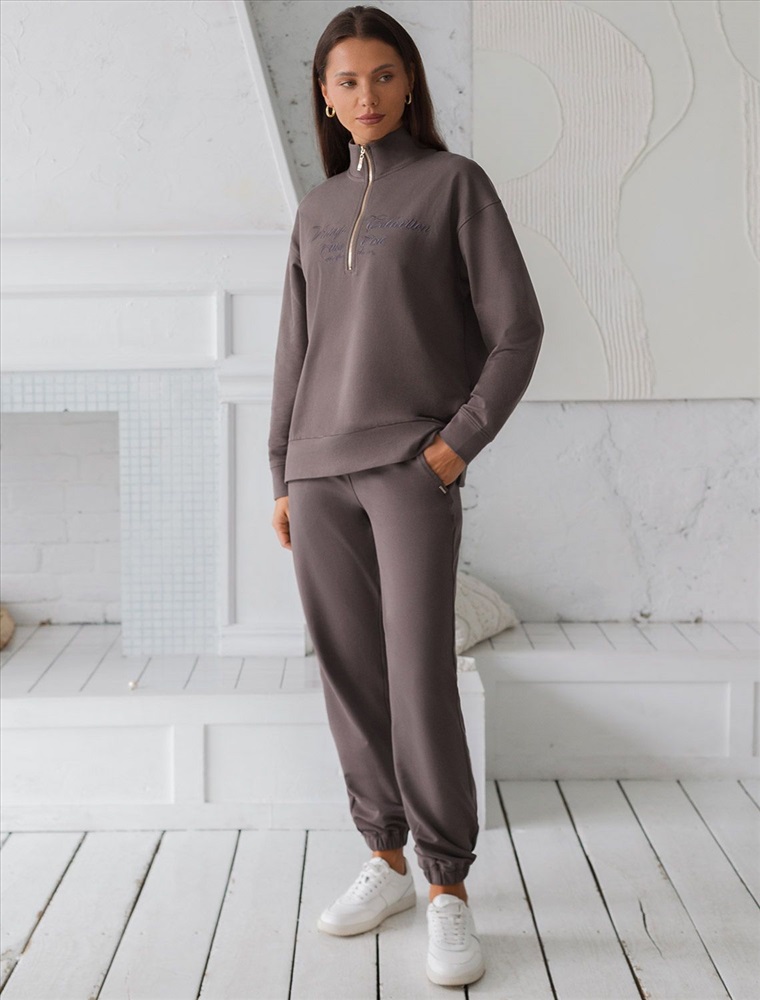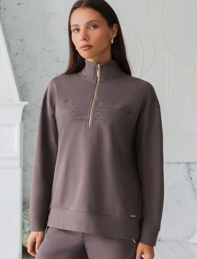 Уютный и комфортный вариант для прохладной погоды – стильный джемпер кофейного цвета с воротом на молнии. Изготовлен из премиального футера двухнитки с добавлением эластана. Материал сохраняет форму при длительном ношении и после многократных стирок, его мягкая текстура дарит ощущение уюта и тепла. Минималистичная вышивка в тон изделия в виде надписи. перевод надписи: Vinlage collection cotton club - Винтажная коллекция Хлопковый клуб. Свободный крой джемпера позволяет не ограничивать движения, что особенно важно для активного образа жизни. Подойдет на любую женскую фигуру, представлена широкая размерная линейка, большие размеры, легко комбинируется с другими вещами, создавая модные образы в стиле спорт-шик. Этот повседневный джемпер сочетает в себе удобство и актуальность, будет универсальным выбором для отдыха или прогулок. Сочетается в костюме с шортами D48.010, брюками D44.152, D44.137, D44.136