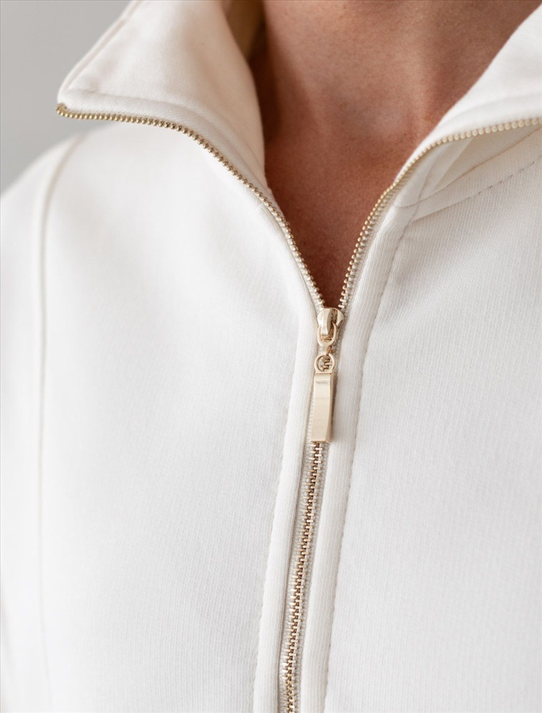 Уютный и комфортный вариант для прохладной погоды – стильный джемпер белого цвета с воротом на молнии. Изготовлен из премиального футера трехнитки с добавлением эластана. Материал сохраняет форму при длительном ношении и после многократных стирок, его мягкая текстура дарит ощущение уюта и тепла.
