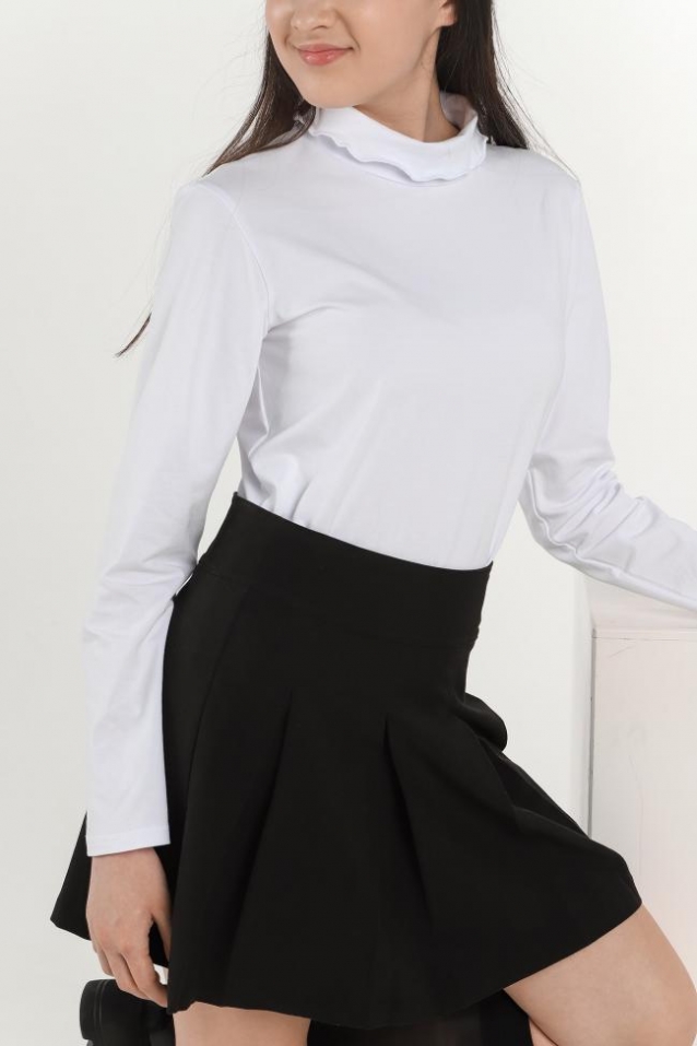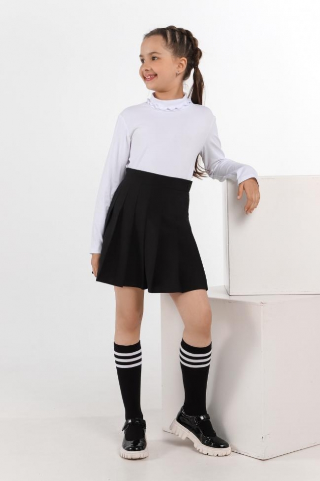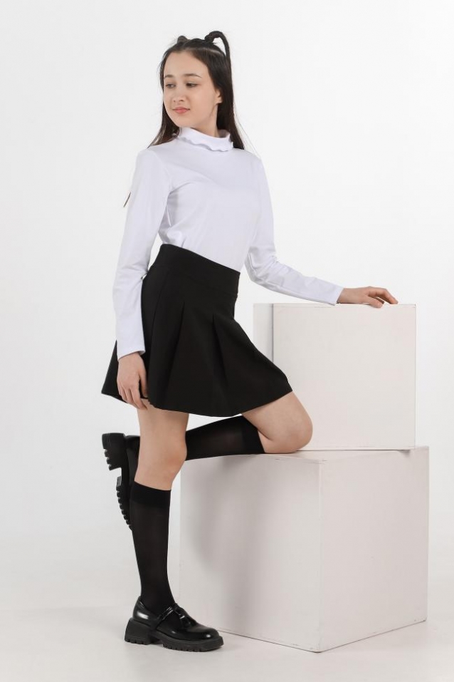 Базовая водолазка для девочки из трикотажного хлопкового полотна с лайкрой. В модели воротник-стойка с прегибом и с волнистым краем.