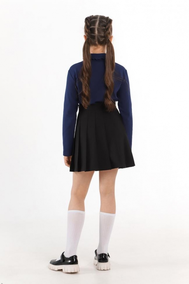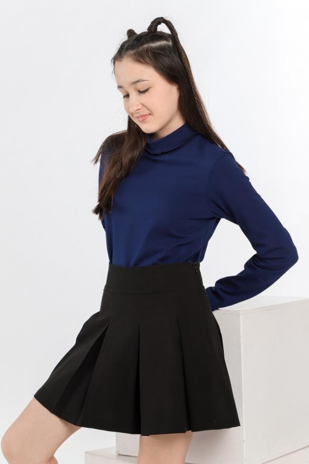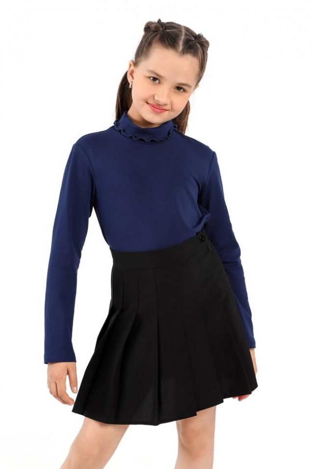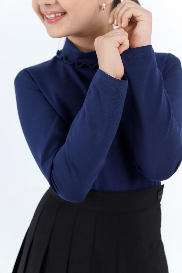 Базовая водолазка для девочки из трикотажного хлопкового полотна с лайкрой. В модели воротник-стойка с прегибом и с волнистым краем.