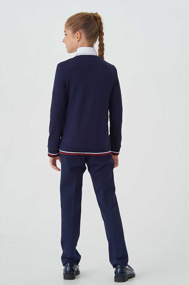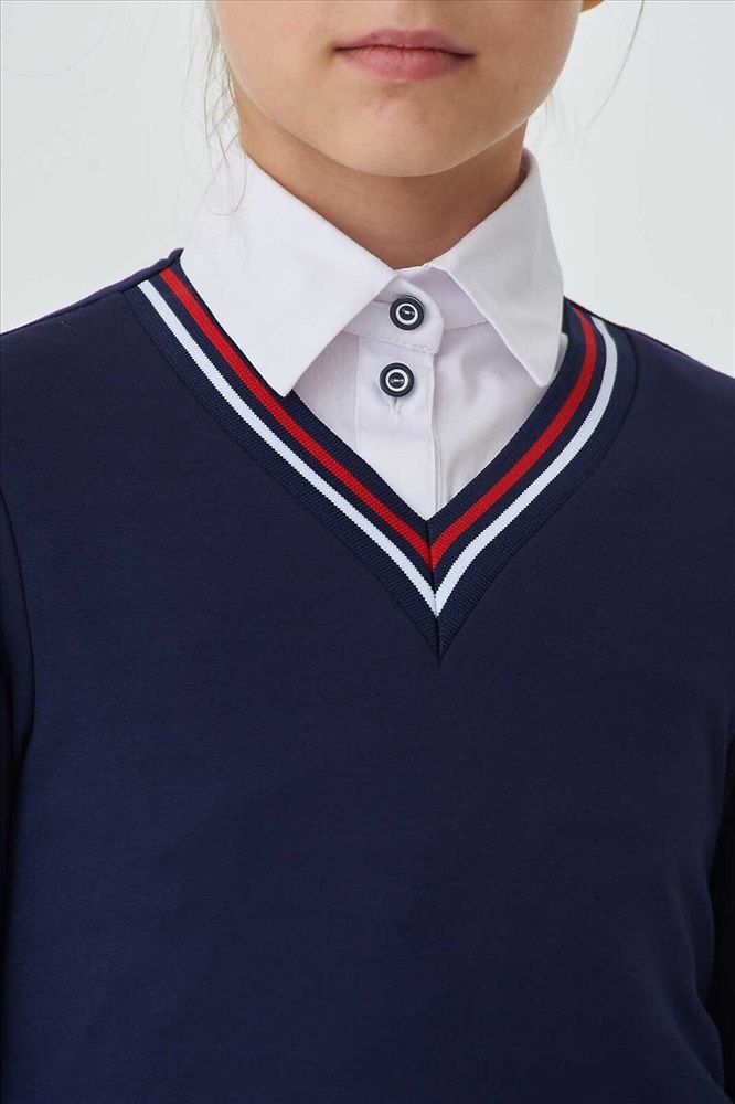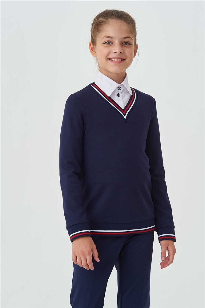 ID товара: 1220995 Акции: -5%, до 24.11.2025 Состав: 58% Вискоза, 37% Полиэстер, 5% Полиуретан Сезон: Демисезон Длина: Средняя Фасон: Прямой Рукав: Длинные Вырез горловины: V-образный Основная ткань: Вискоза Стиль: Повседневный Страна бренда: Россия Страна производства: Россия Элегантный трикотажный джемпер классического темно-синего цвета для девочки с V-образным вырезом. Вырез горловины, низ джемпера и манжеты оформлены фактурной резинкой в контрастную красно-белую полоску. Комментарии к товару