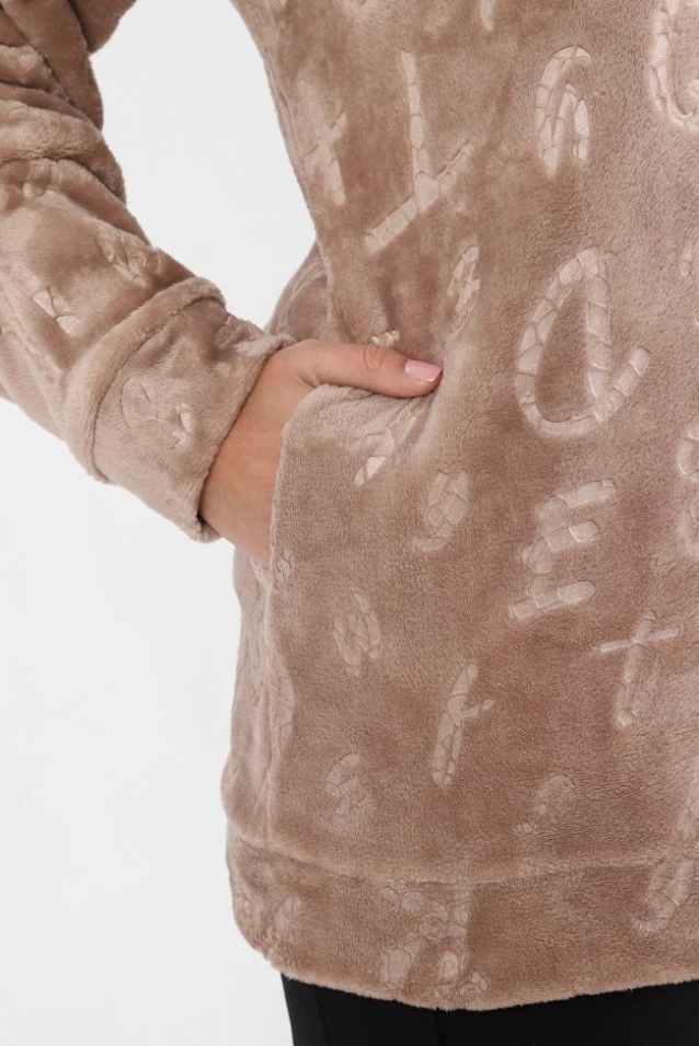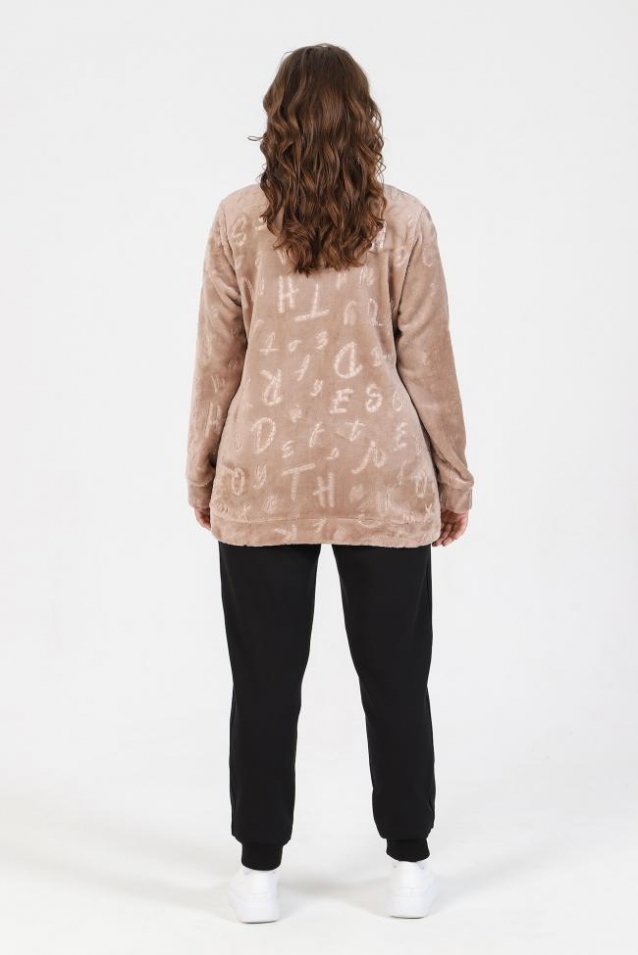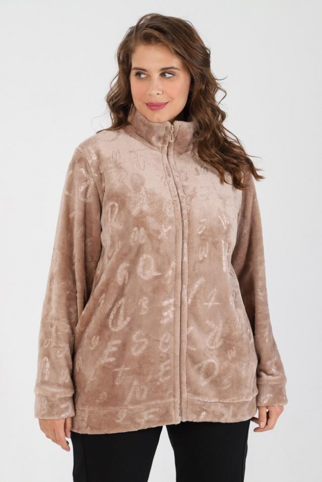 Куртка – из полотна «велсофт», прямого силуэта, с длинными втачными рукавами, воротником «стойка», карманами в боковых швах, центральной бортовой застежкой на тесьму «молния» и вышивкой в верхней части левой полочки. Нижние срезы рукавов обработаны притачными манжетами. Низ изделия – с притачным поясом.