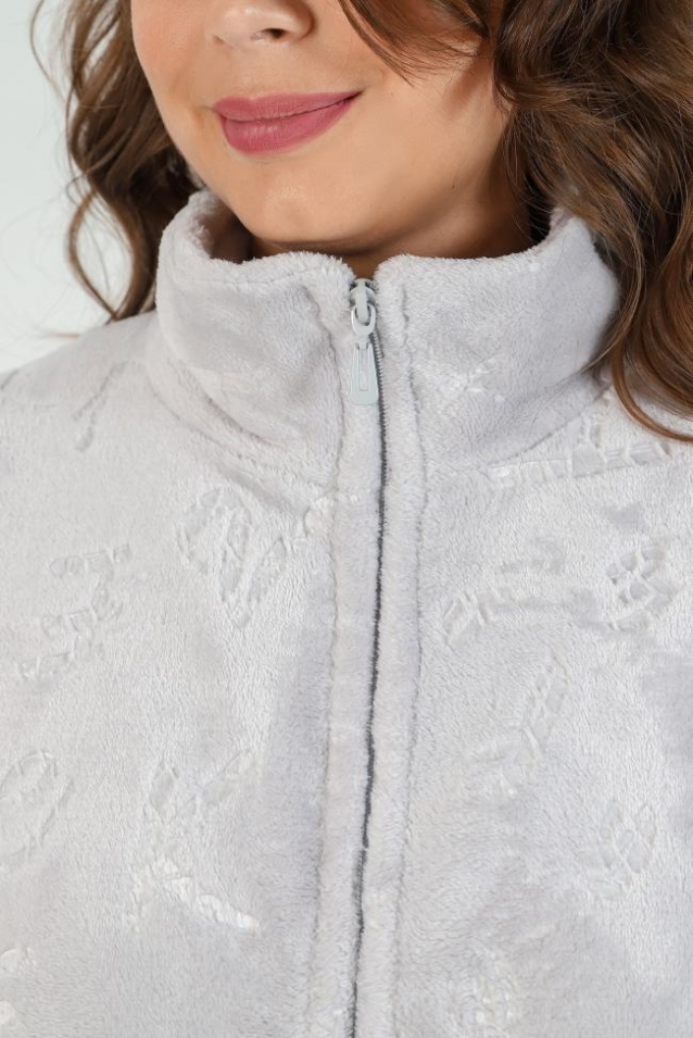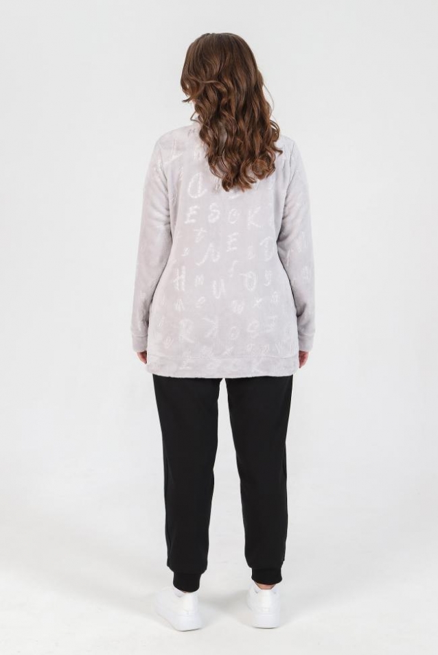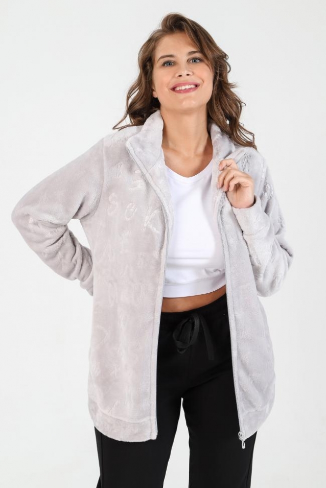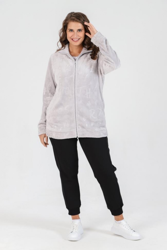 Куртка – из полотна «велсофт», прямого силуэта, с длинными втачными рукавами, воротником «стойка», карманами в боковых швах, центральной бортовой застежкой на тесьму «молния» и вышивкой в верхней части левой полочки. Нижние срезы рукавов обработаны притачными манжетами. Низ изделия – с притачным поясом.