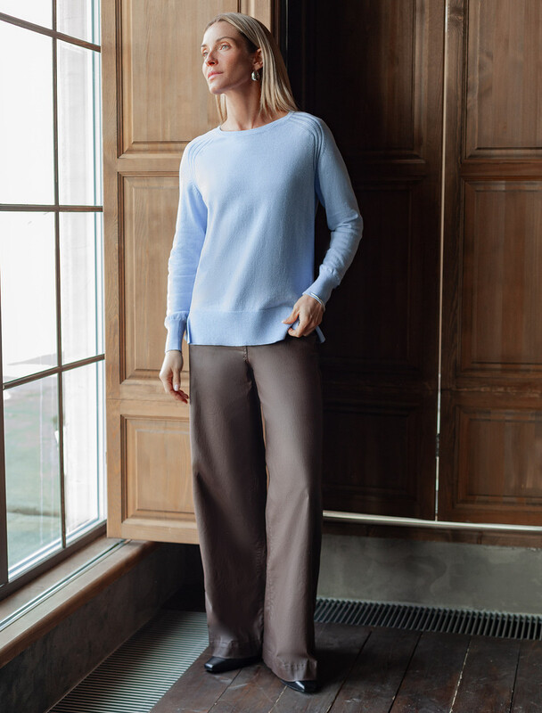Джемпер тонкой вязки выполнен из хлопка с добавлением кашемира. Лаконичная модель с круглым вырезом дополнена декоративными швами и металлическим логотипом бренда. Мягкая и очень приятная пряжа совершенно не колется, сохраняет тепло при этом не перегревая, гарантируя безупречный комфорт.