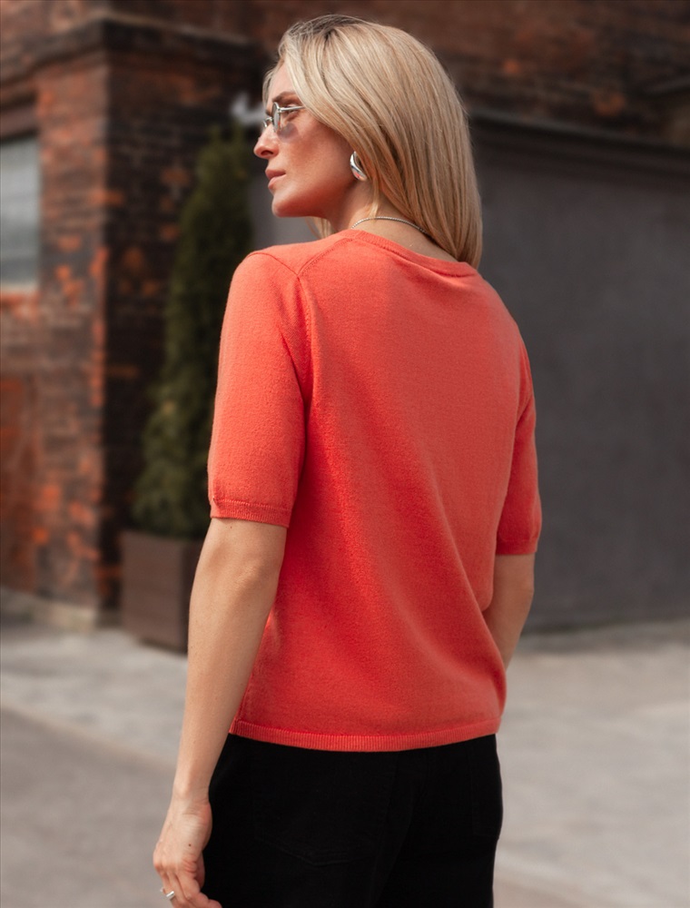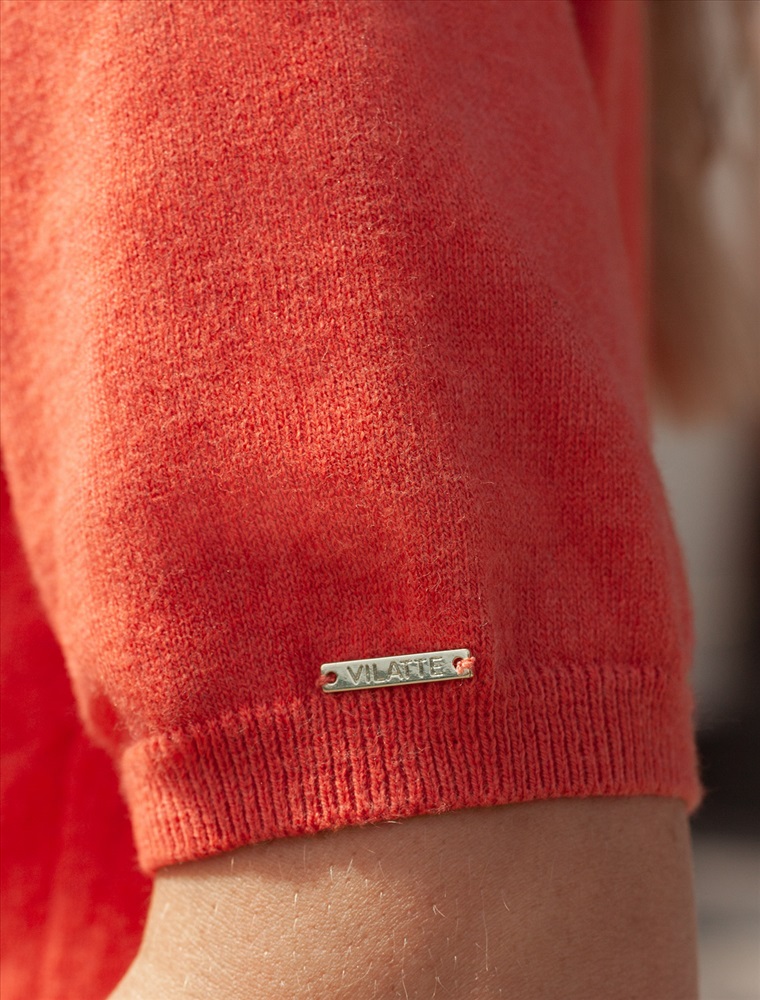 Джемпер тонкой вызки выполнен из мягкой хлопковой пряжи с кашемиром. Модель с круглым вырезом и коротким рукавом превосходная альтернатива футболке осенью. Сочетается с любым низом и с легкостью поможет создать образы в стиле old-money. Подходит для офисного дресс-кода и повседневного аутфита. Из украшений неизменно металлический логотип бренда