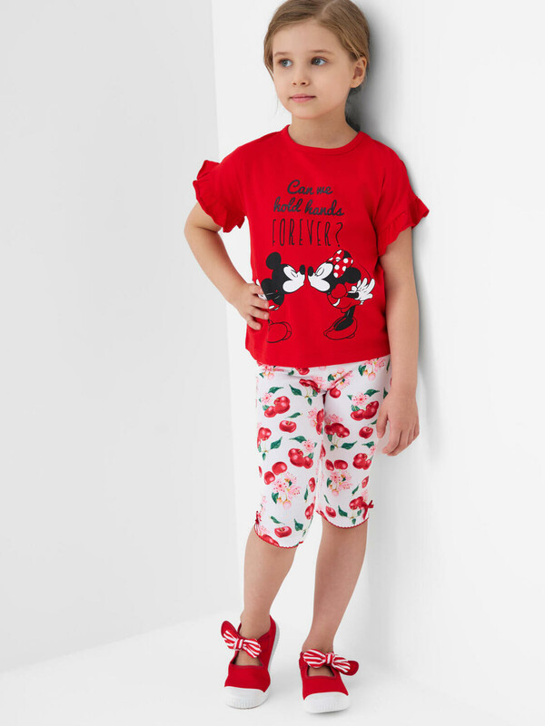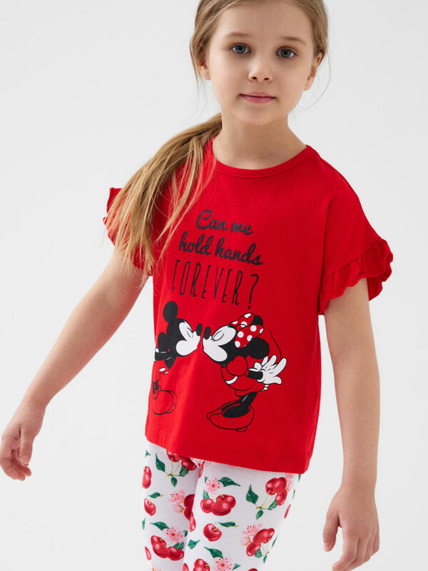Детская футболка для девочки. Модель свободного кроя, выполнена из эластичного хлопкового трикотажа джерси. Красочный принт с любимыми мультяшными героями Минни и Микки Маус. Горловина круглая. Рукава с оборками.
