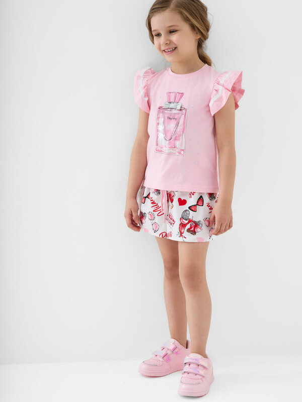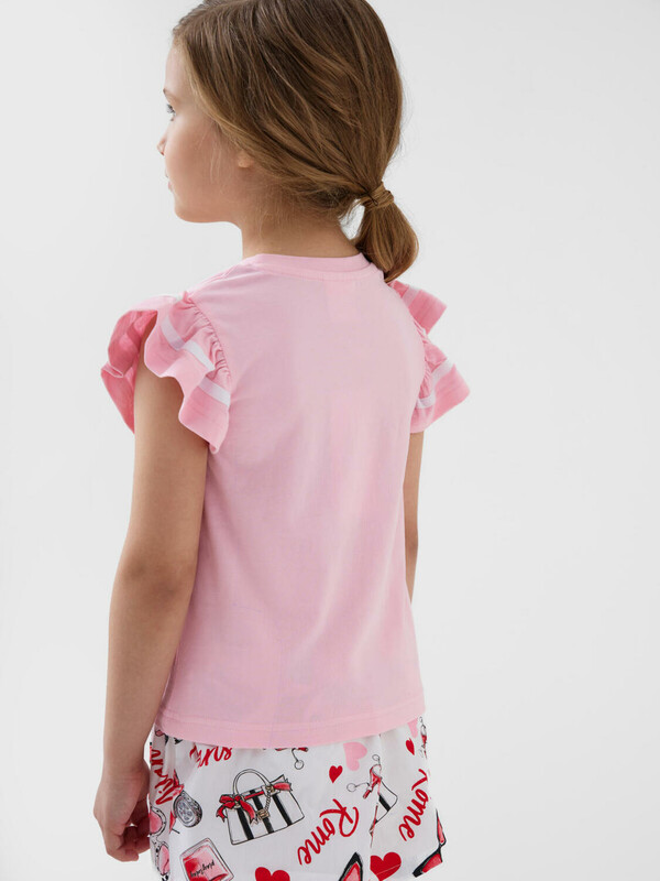 Детская футболка для девочки. Модель прямого кроя, выполнена из эластичного хлопкового трикотажа джерси. Спереди - крупный красочный принт. Горловина круглая. Рукава-крылышки.
