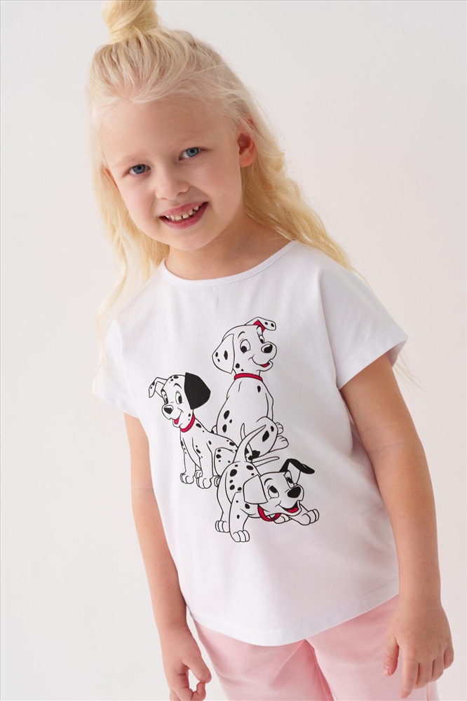 ID товара: 1240024 Состав: 95% хлопок, 5% эластан Сезон: Весна/Лето Детская футболка для девочки. Модель свободного кроя, выполнена из эластичного хлопкового трикотажа джерси. Спереди расположен крупный принт с героями из любимого мультфильма "101 далматинец". Горловина круглая. Сзади декорирована бантом. Комментарии к товару