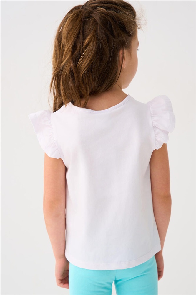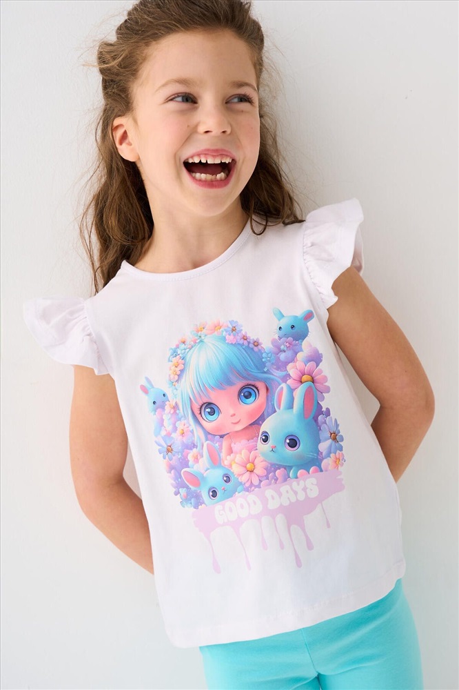 Детская футболка для девочки. Модель прямого кроя, выполнена из эластичного хлопкового трикотажа джерси. Спереди расположен крупный красочный принт. Горловина круглая. Рукава-крылышки.