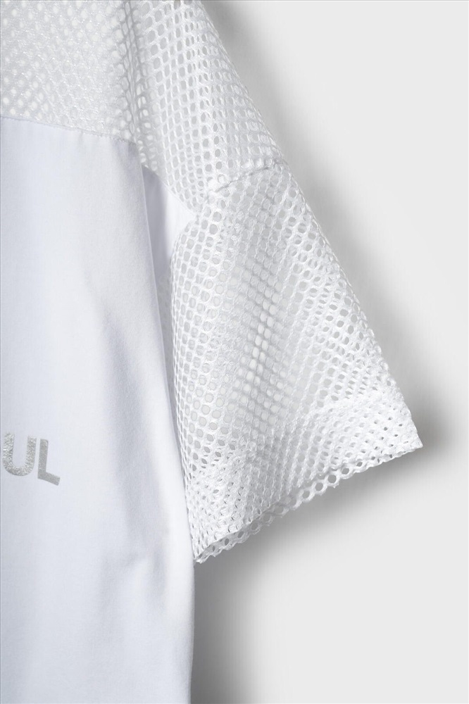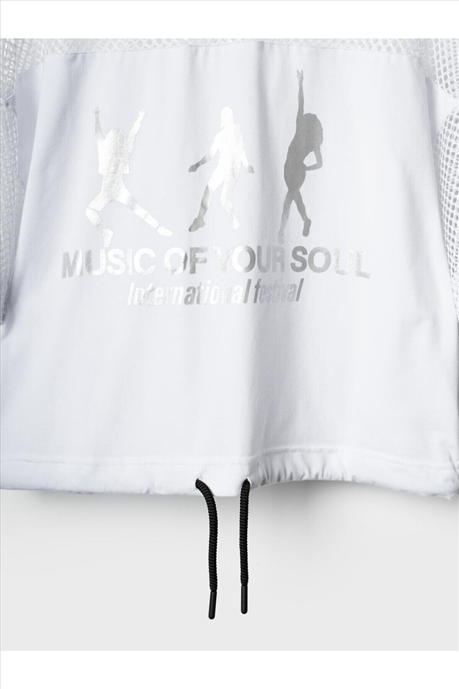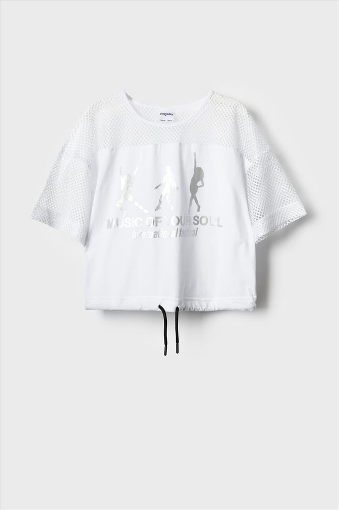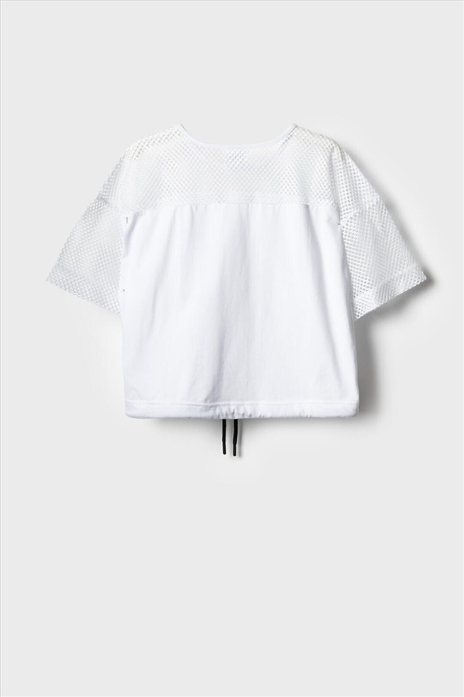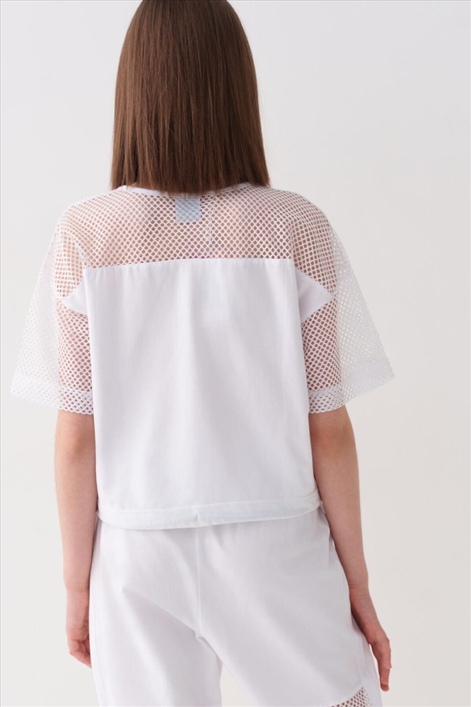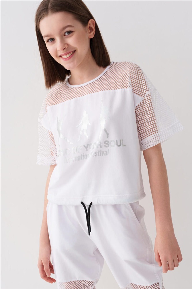 Футболка оверсайз для девочки подростка. Модель выполнена из эластичного хлопкового трикотажа джерси. Рукава и верхняя часть выполнены из сетки. На груди расположен крупный принт. Горловина круглая. В нижней части — шнурок для регулировки посадки.