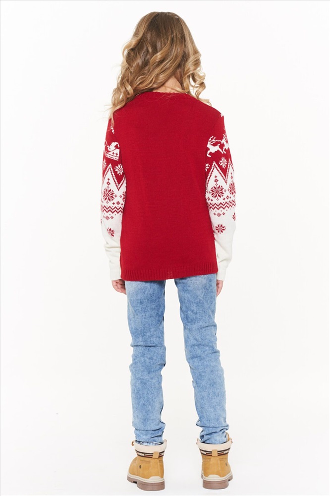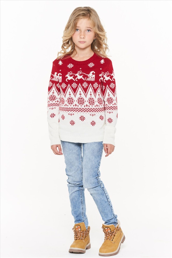 Джемпер для девочек средней длины. Полуприлегающий силуэт, круглая горловина и длинные рукава. Спереди вывязан зимний орнамент. Можно собрать FAMILY LOOK: #101192, #100955, #93719.