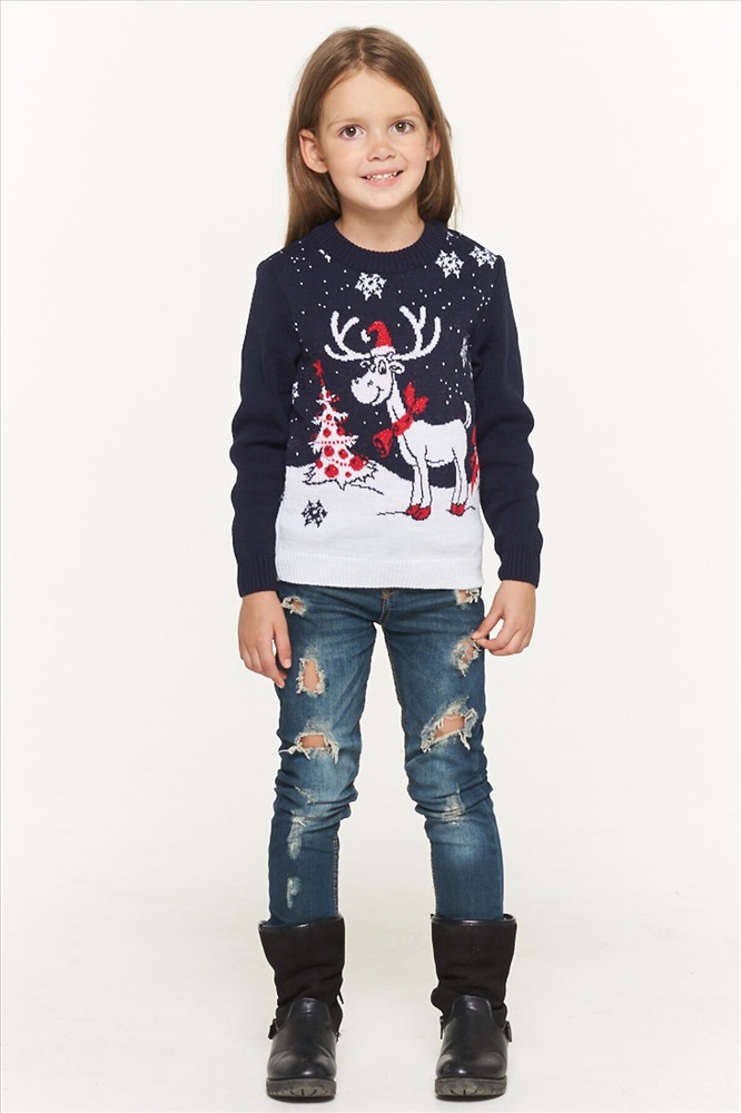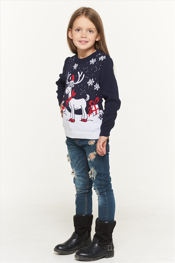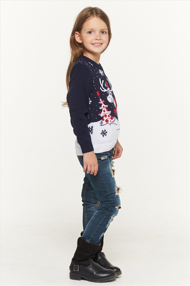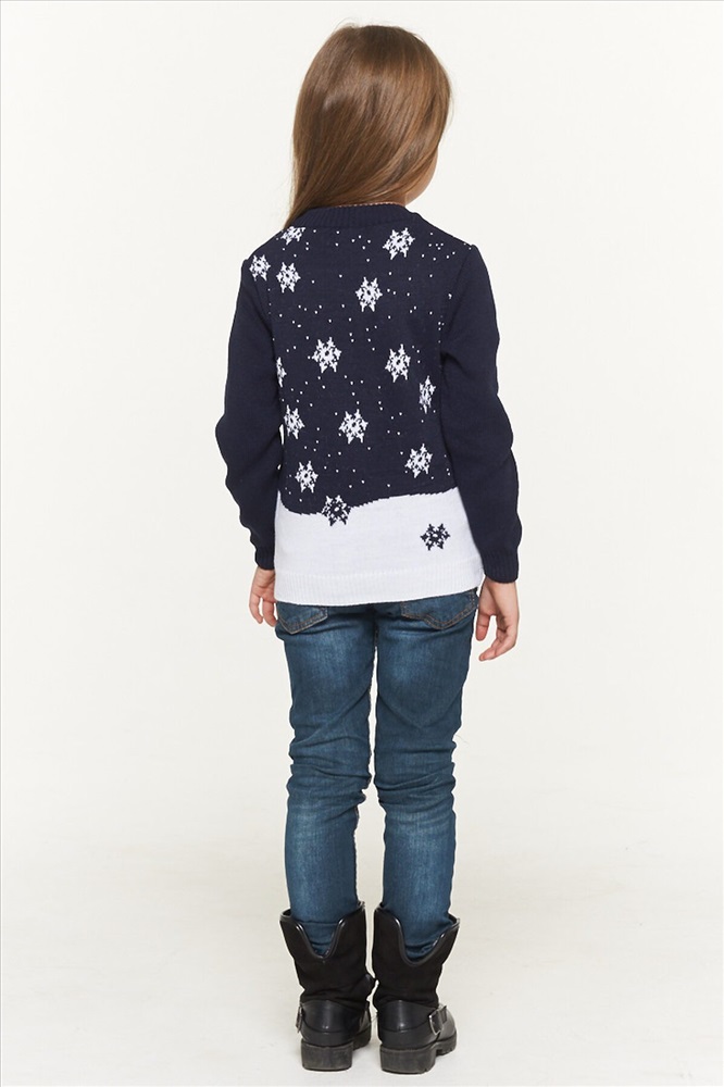 Джемпер трикотажный для девочки, с зимним, новогодним принтом.