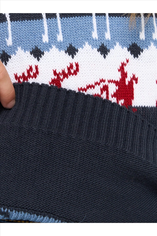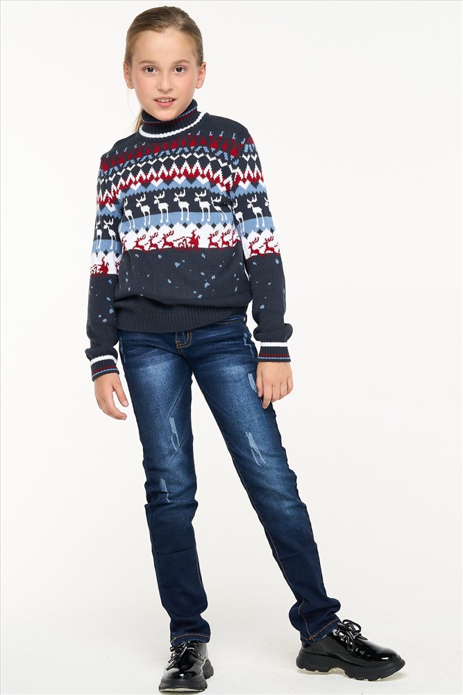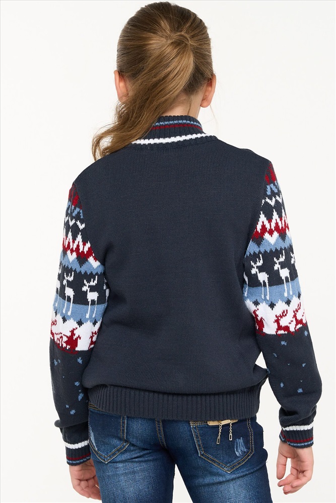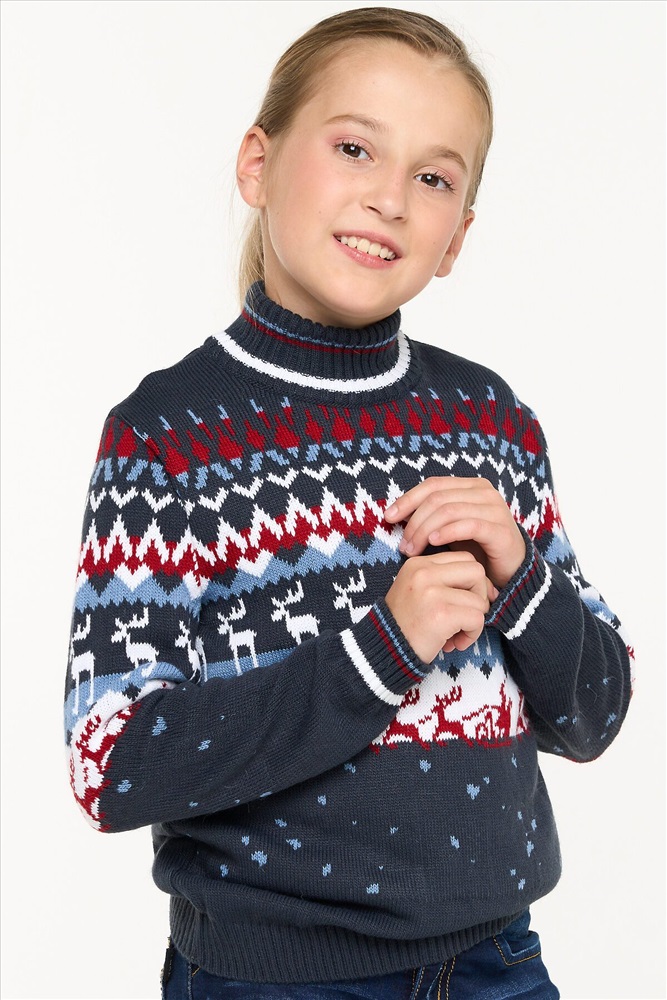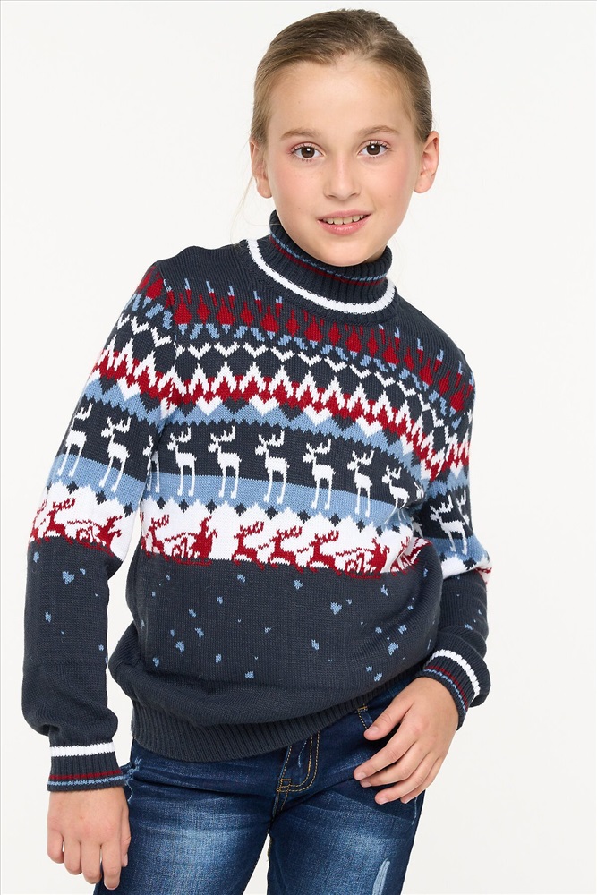 Детский джемпер с воротником-стойкой, декорирован жаккардовым рисунком.