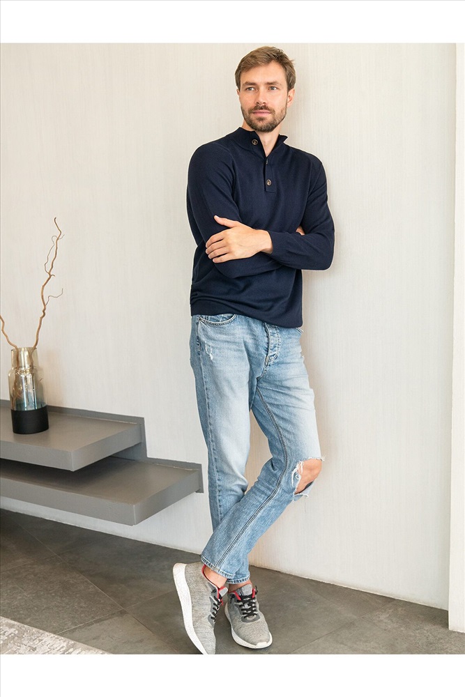 ID товара: 935567 Акции: -5%, до 24.11.2025 Состав: 55% Хлопок. 45% ПАН (акрил) Сезон: Весна/Лето Длина: Средняя Фасон: Прямой Рукав: длинные Вид застежки: Пуговицы Вырез горловины: Воротник-стойка Основная ткань: Хлопок Стиль: Повседневный Страна бренда: Россия Страна производства: Китай Темно-синий джемпер с воротом, застегивающимся на черепаховые пуговицы, связали из мягкого хлопка с добавлением акрила; состав, который отлично согревает, не колется и при этом не перегревает тело, поэтому вещь получилась максимально комфортной для переменчивой погоды. Повседневный образ поддержат светлые брюки, синие джинсы и броги. Комментарии к товару