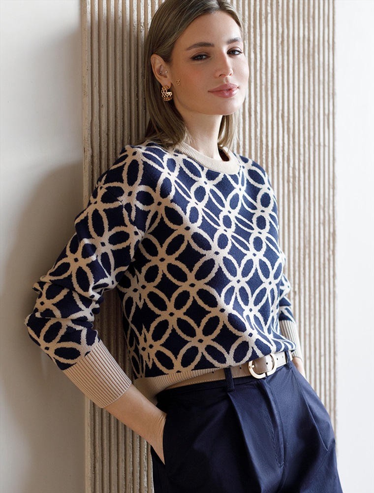 Джемпер жаккардовой вязки выполнен из мягкой пряжи на основе вискозы с добавлением кашемира. Очень приятная на ощупь пряжа дарит абсолютный комфорт, сохраняя оптимальную температуру не перегревая. Совет стилиста: модель с круглым вырезом и спущенной линией плеч гармонично дополнит повседневные образы с джинсами или брюками, при этом будет также выигрышно сочетаться с юбкой в заправку.