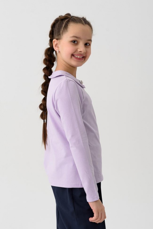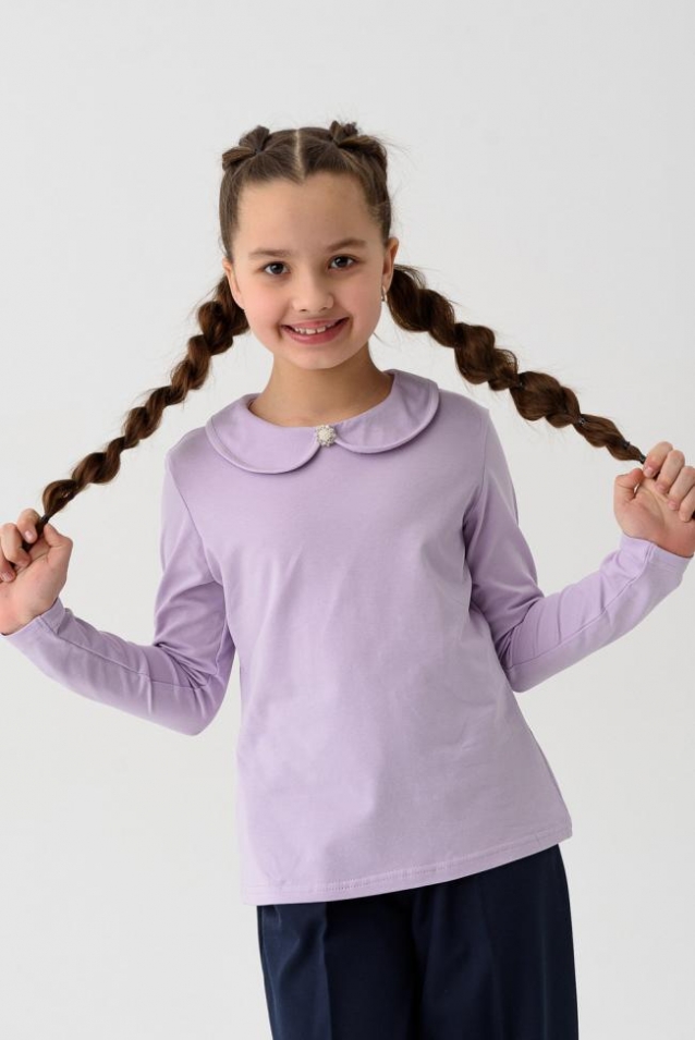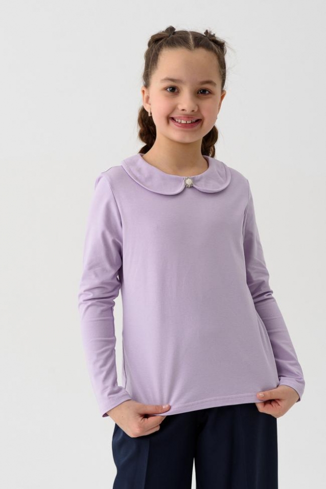 Джемпер для девочек младшего и старшего школьного возраста, из трикотажного однотонного полотна кулирка с лайкрой. Джемпер полуприлегающего силуэта, с втачным длинным рукавом, без застежки, с воротником на базе плосколежащего с концами округлой формы. Спереди и на спинке отсутствуют линии членения. Круглые концы воротника обработаны узкой окантовочной лентой из того же полотна в 4 сложения. Рукав одношовный. Низа рукава и изделия подогнуты. Спереди по центру горловины прикреплена брошь.
