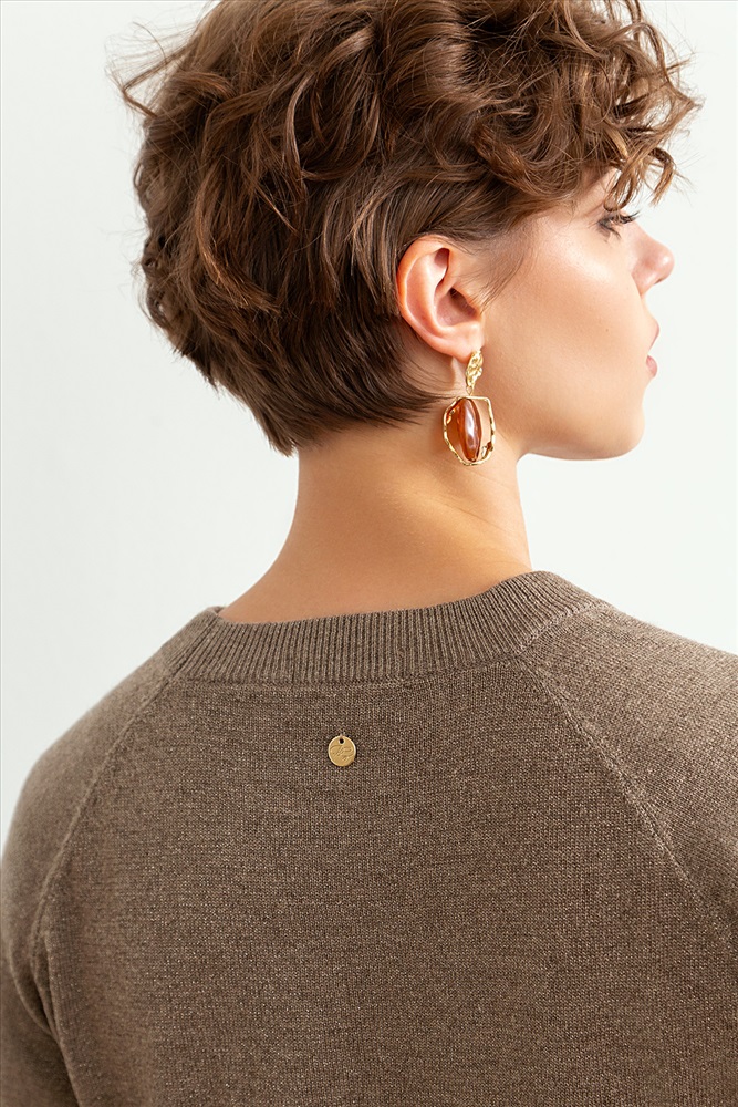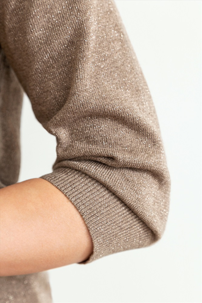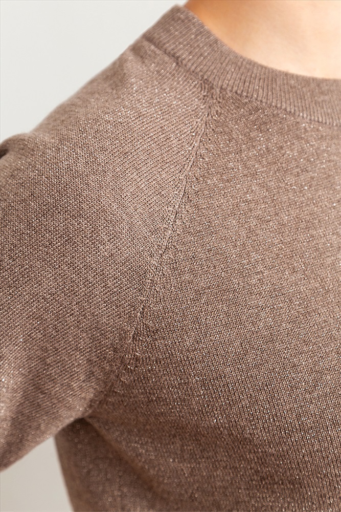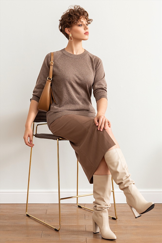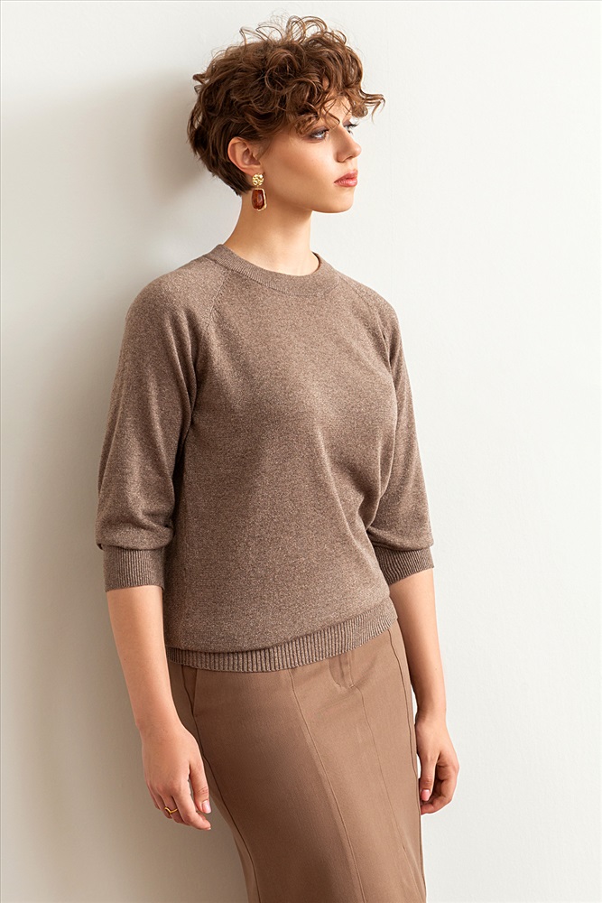 Вязаный джемпер с коротким рукавом из смесовой пряжи с добавлением вискозной крученной нити. Полукруглый вырез горловины подчеркивает изящество линии шеи. Джемпер комбинируется как с юбкой, так и с брюками или джинсами, выступает как самостоятельный верх.