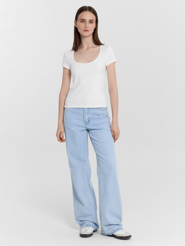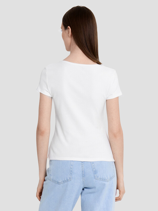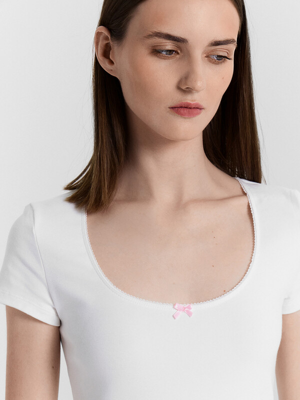 Джемпер прилегающего силуэта. Горловина овальная, глубокая. По краю горловины настрочена эластичная тесьма (с зубом 8 мм (06/08) КТЕ6-8). Рукава втачные короткие. Нижние срезы джемпера и рукавов обработаны швом вподгибку.