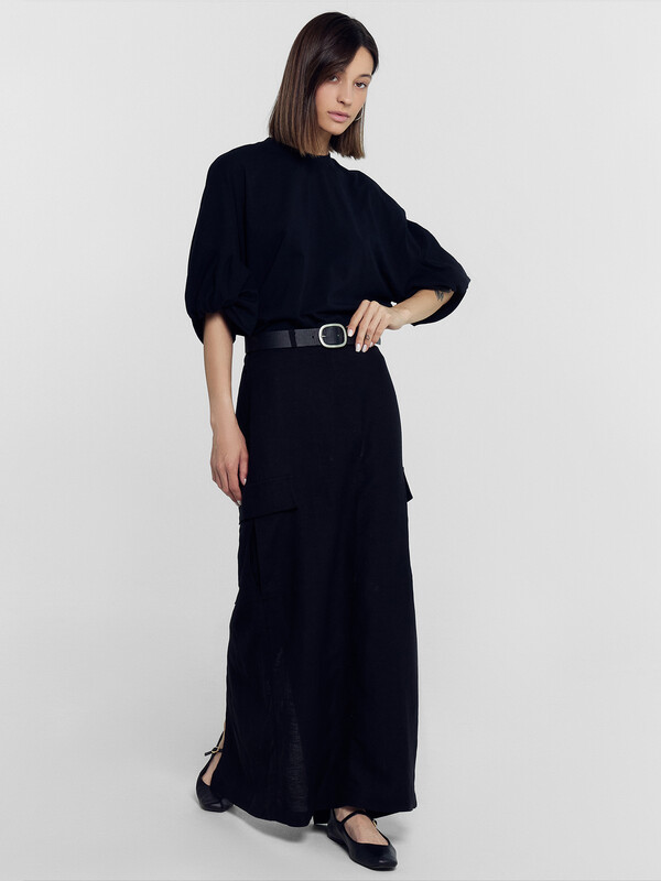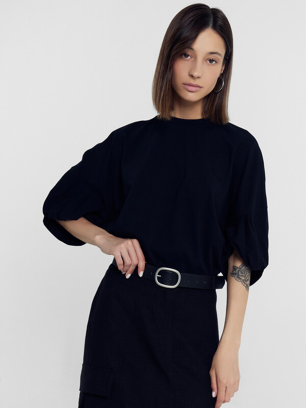 Рукав обьемный, со средним швом и перекрутом по низу.