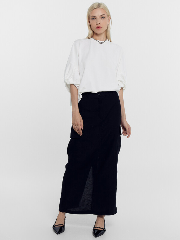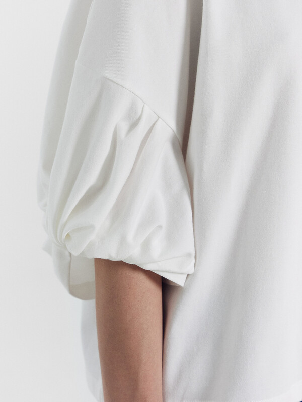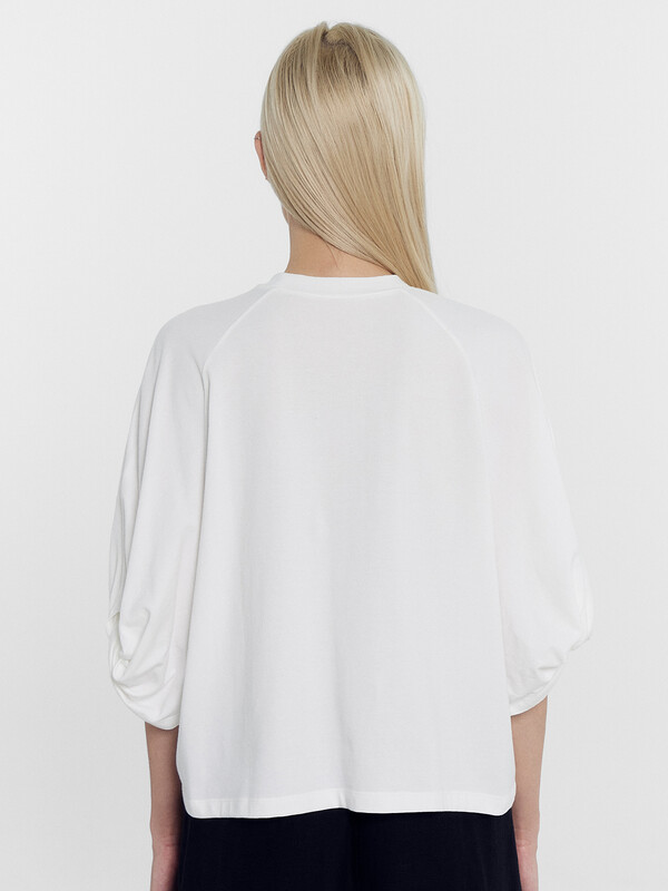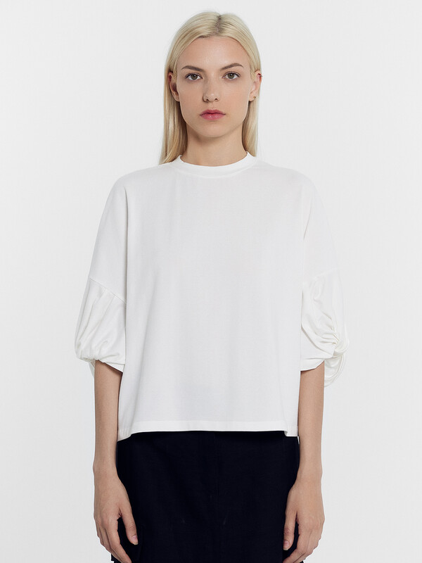 Рукав обьемный, со средним швом и перекрутом по низу.