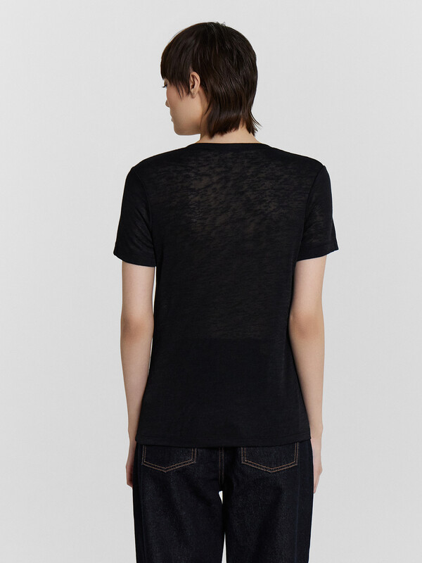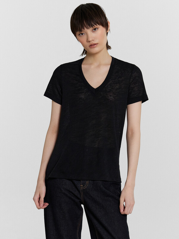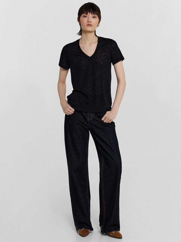 Джемпер прямого силуэта, свободный. Горловина V-образной формы, глубокая, обработана бейкой из основного полотна. Рукава втачные, корткие. Нижние срезы джемпера и рукавов обработаны швом вподгибку.