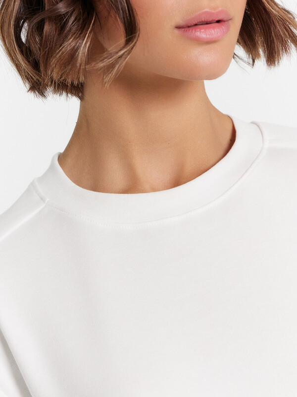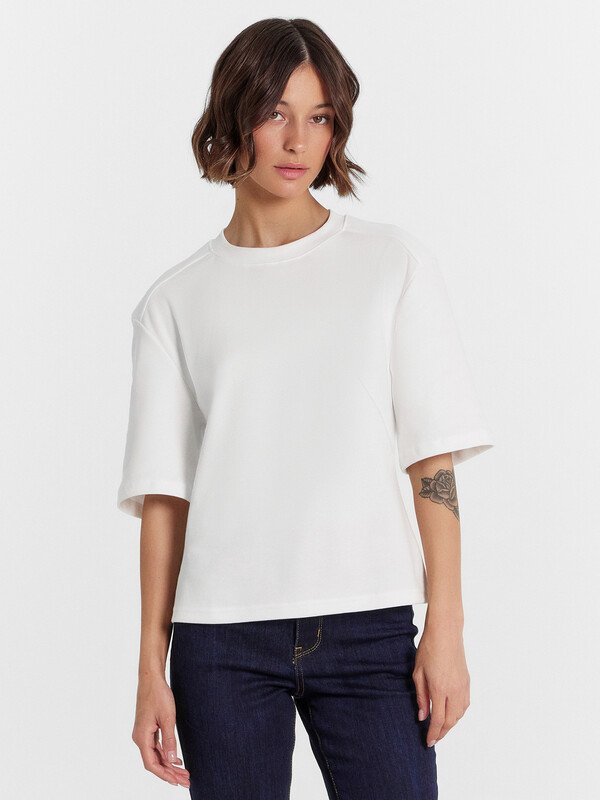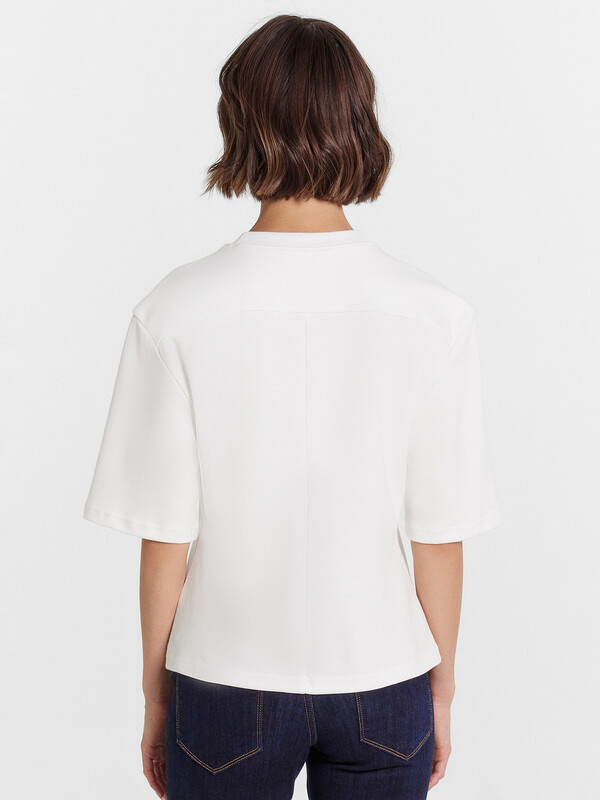 Джемпер женский полуприлегающего силуэта из трикотажного полотна интерлок. Горловина круглой формы обработана обтачкой из рибаны. Плечевой шов смещен в сторону переда. Плечо спущено, пройма углублена. Рукав втачной, широкий, короткий. На детали переда застрочены вытачки. Спинка со средним швом и отрезной кокеткой. Нижнтие срезы рукавов и джемпера обработаны швом вподгибку.