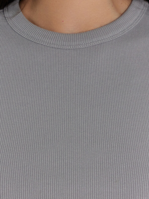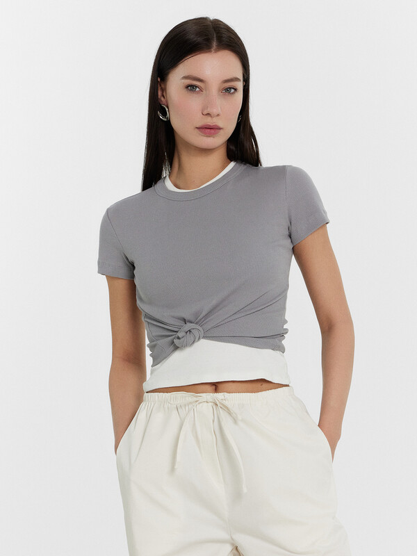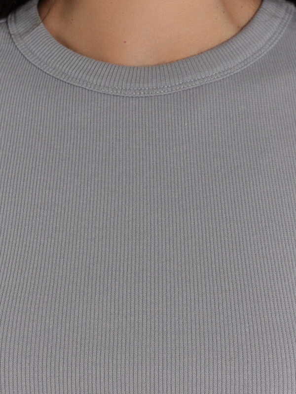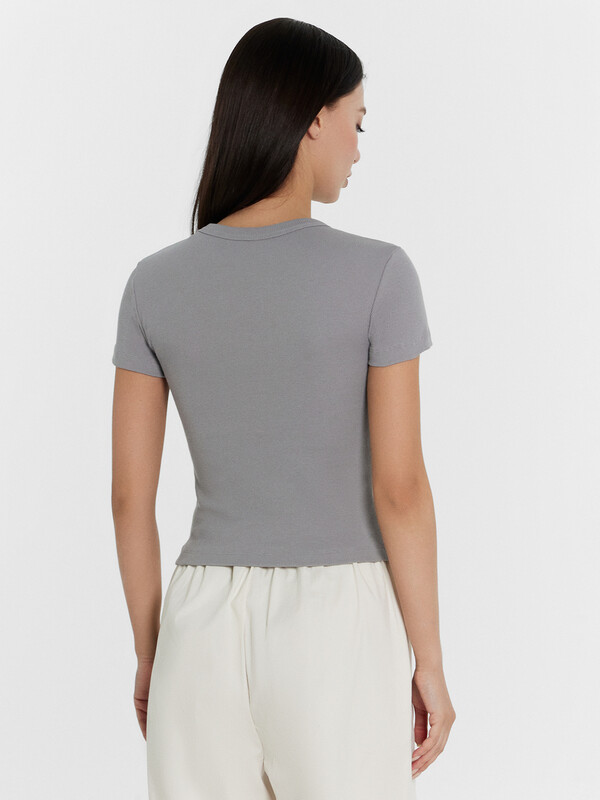 Джемпер прилегающего силуэта. Горловина круглой формы обработана бейкой в 4 сложения из основного полотна. Рукава втачные, короткие. Нижние срезы джемпера и рукавов обработаны швом вподгибку.