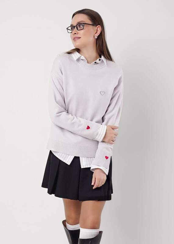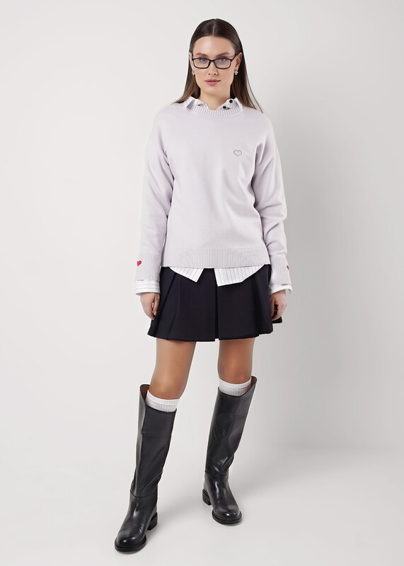 Вязаный джемпер свободного силуэта из вискозной пряжи с добавлением нейлона. Основное переплетение плотная гладь. Округлая горловина с бейкой. Длинный втачной рукав. По низу изделия и рукава манжет. Спереди и по низу рукавов вышивка.