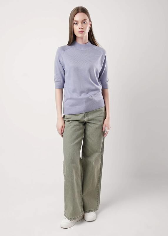 Вязаный джемпер прямого силуэта акриловой пряжи с добавлением хлопка, переплетение гладь. Короткий рукав реглан. Округлая горловина с полустойкой. По низу изделия и рукавов манжеты.