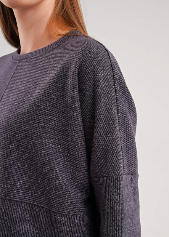 Джемпер свободного кроя из трикотажного поливискозного полотна джерси. Спущенный длинный рукав. Округлая горловина с обтачкой. Спереди резы с разным направлением полос. Боковые разрезы. По низу рукава и изделия потайной стежок.